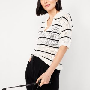 Open-Stitch Polo Sweater: spread v-neck collar, elbow-length sleeves, pullover style, #664105
