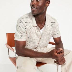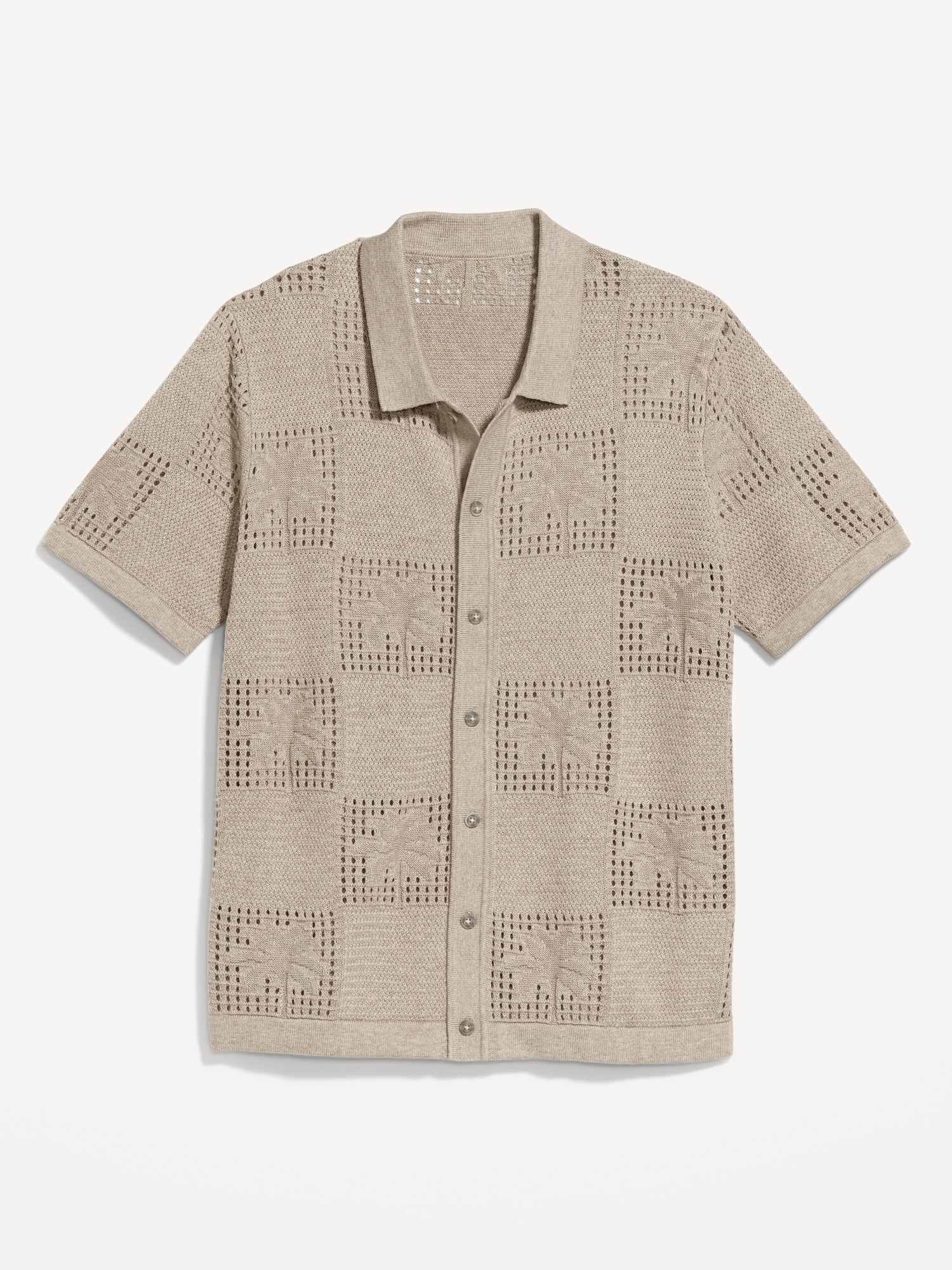 Open-Stitch Sweater Shirt: spread collar, short sleeves, full-button front, textured patterns vary, #762317