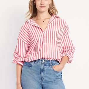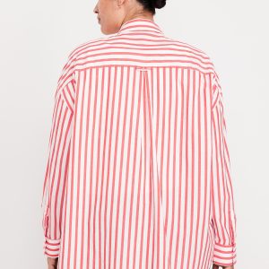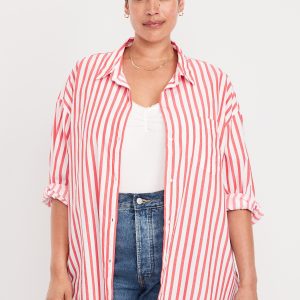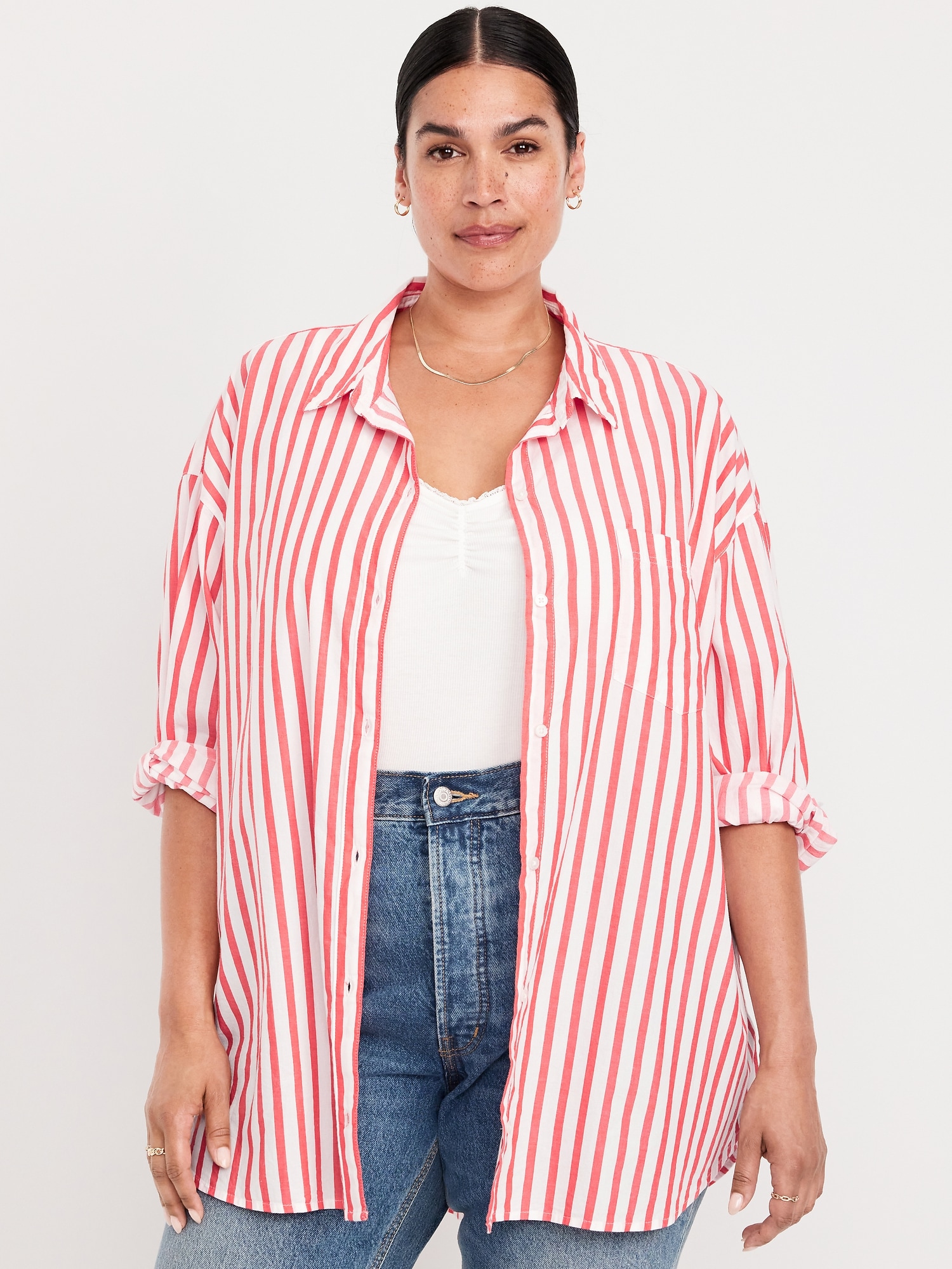 Oversized Button-Down Boyfriend Shirt: spread collar, long sleeves with buttoned cuffs, full-button front, patch chest pocket, curved hem, vertical stripes, #798437