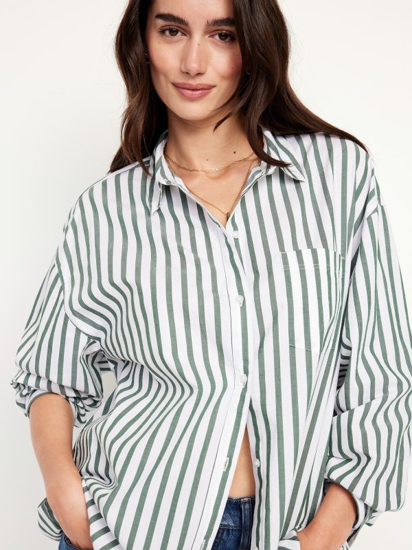 Oversized Button-Down Boyfriend Shirt: spread collar, long sleeves with buttoned cuffs, full-button front, patch chest pocket, curved hem, vertical stripes, #798437