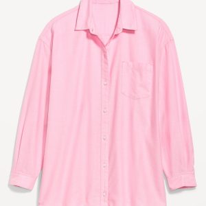 Oversized Button-Down Boyfriend Shirt: spread collar, long sleeves with buttoned cuffs, full-button front, patch chest pocket, curved hem, vertical stripes, #798437