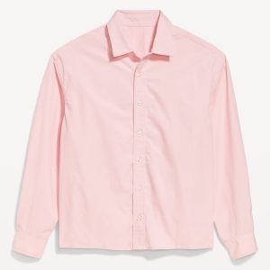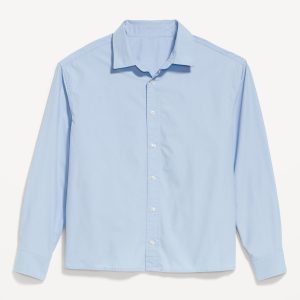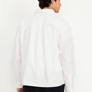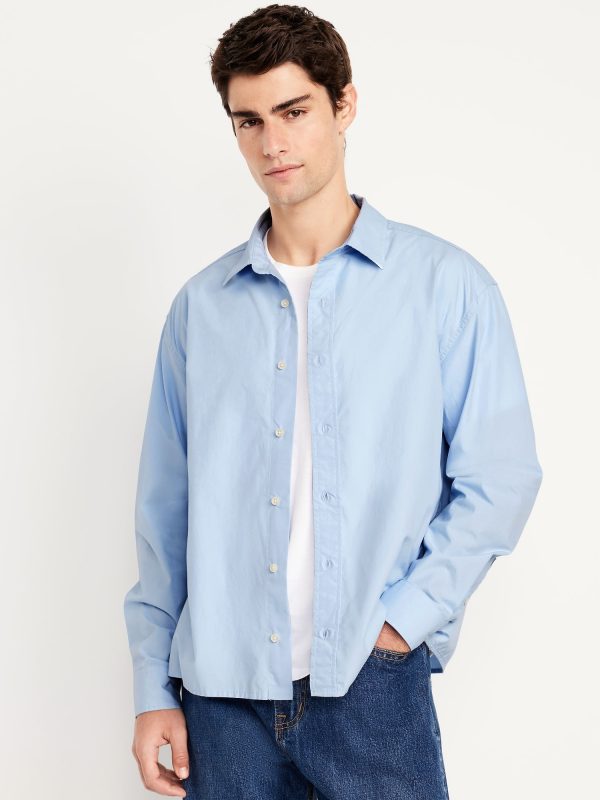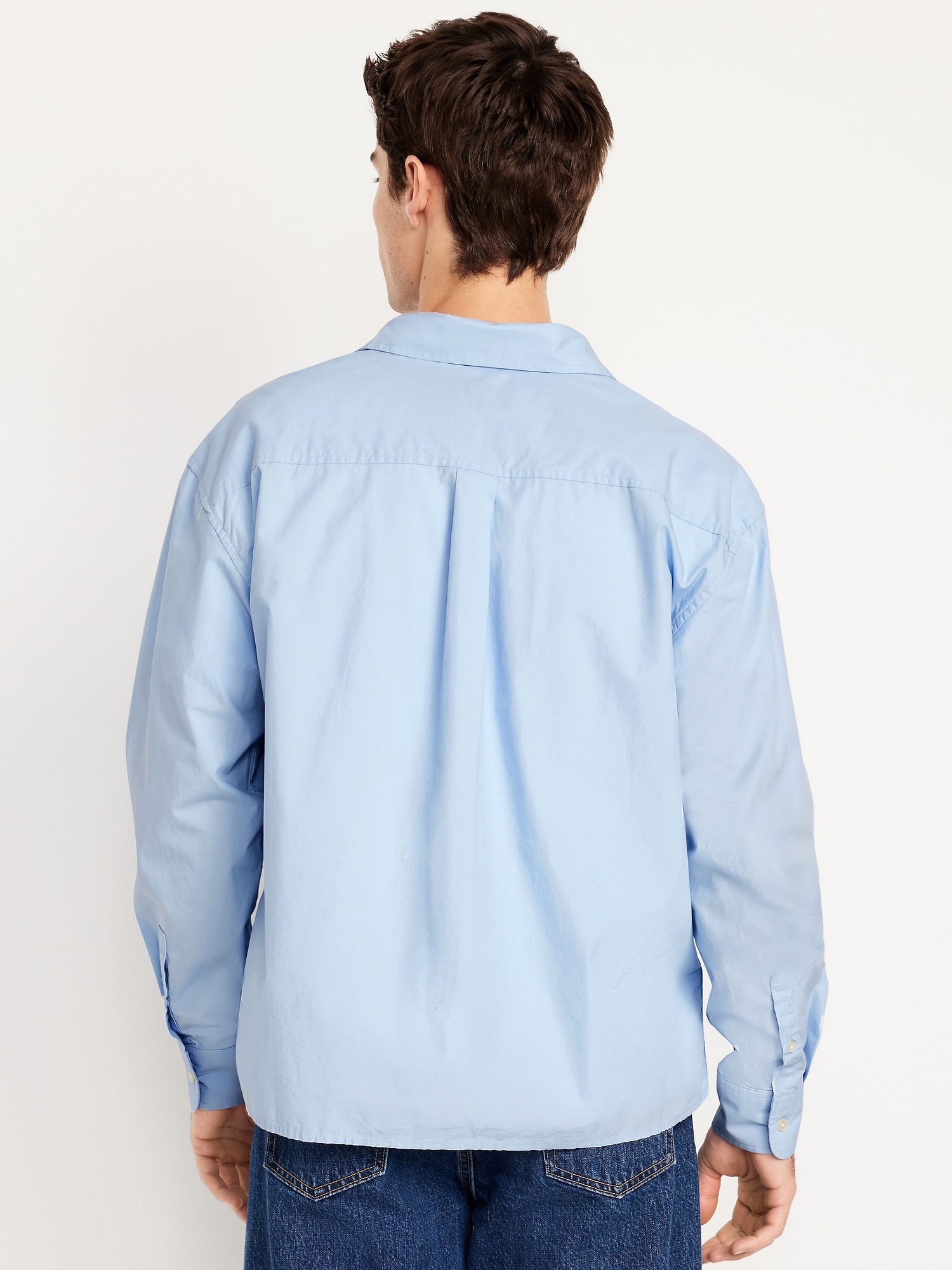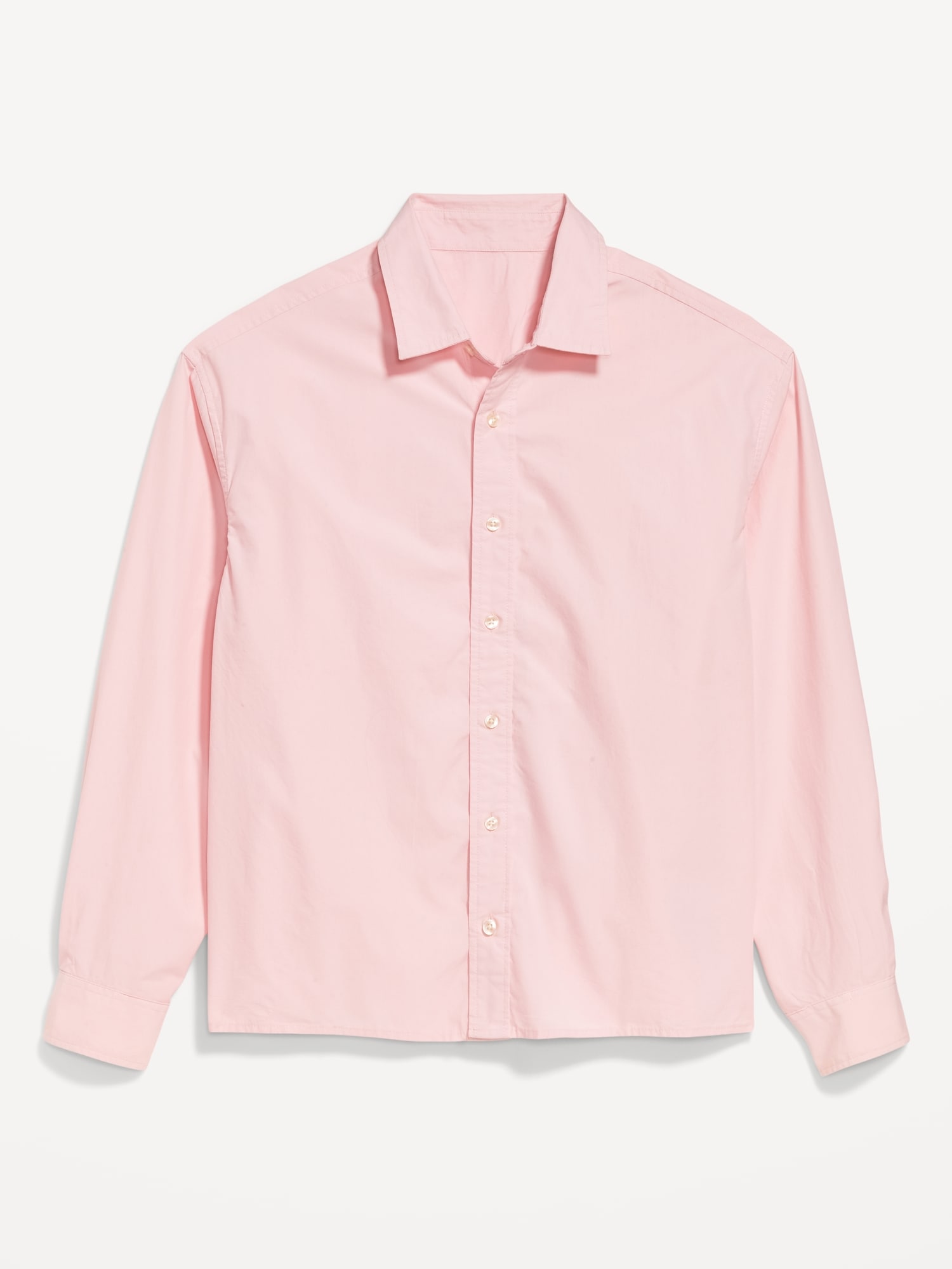 Oversized Cropped Poplin Shirt: spread collar, long sleeves, buttoned cuffs, full-button front, #781620