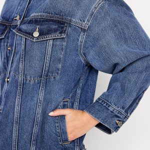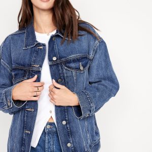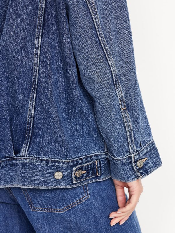 Oversized Jean Trucker Jacket: studded accents, spread collar, long sleeves with buttoned cuffs, full-button front, button-flap chest pockets, vertical welt pockets, #790495