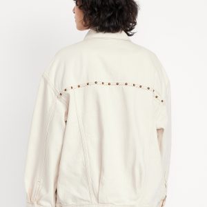 Oversized Jean Trucker Jacket: studded accents, spread collar, long sleeves with buttoned cuffs, full-button front, button-flap chest pockets, vertical welt pockets, #790495