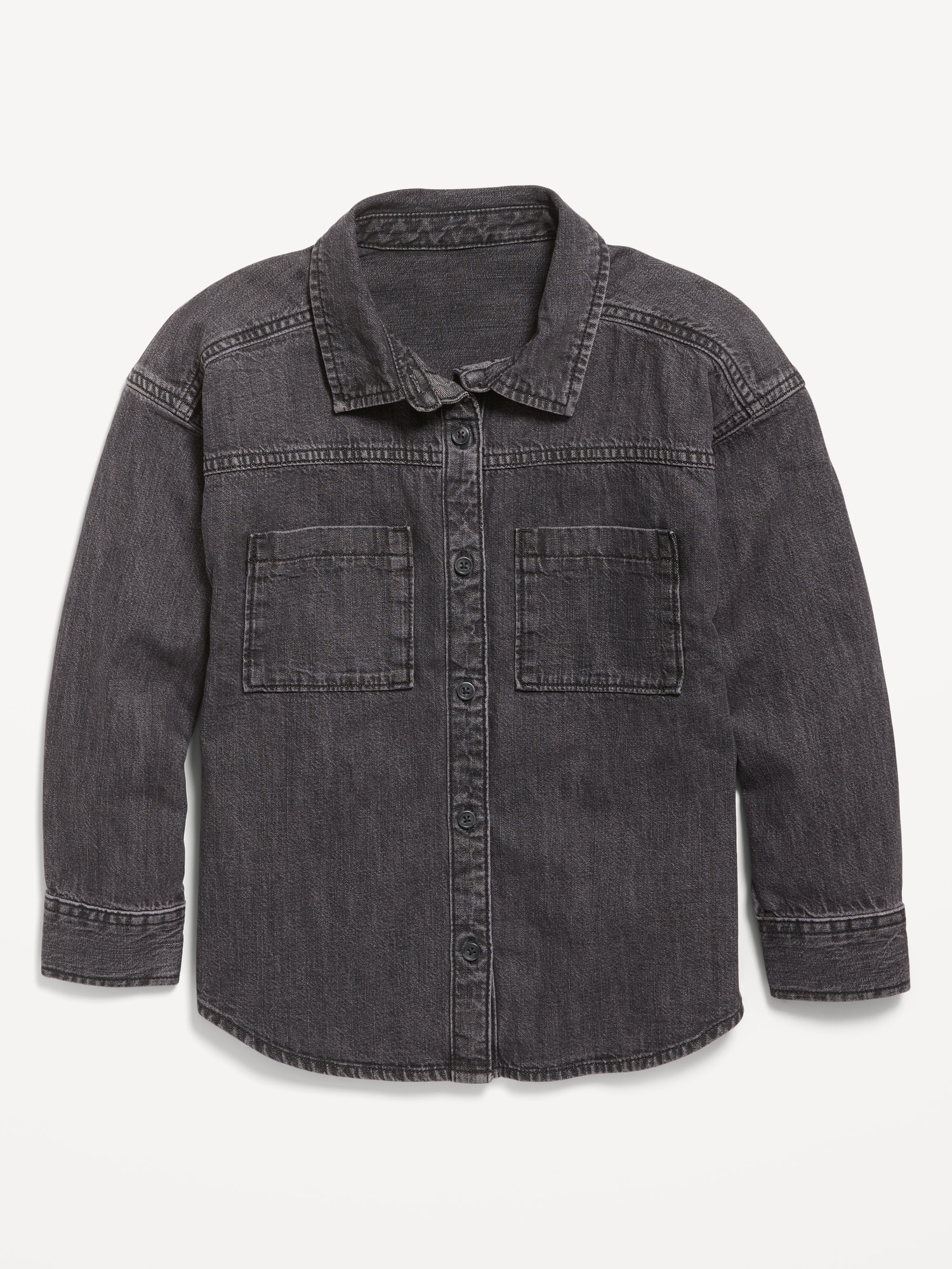 Oversized Pocket Jean Top for Girls: spread collar, long sleeves, drop shoulders, buttoned cuffs, patch pockets at chest, full length buttoned placket, round hem, all-over star print, #806101