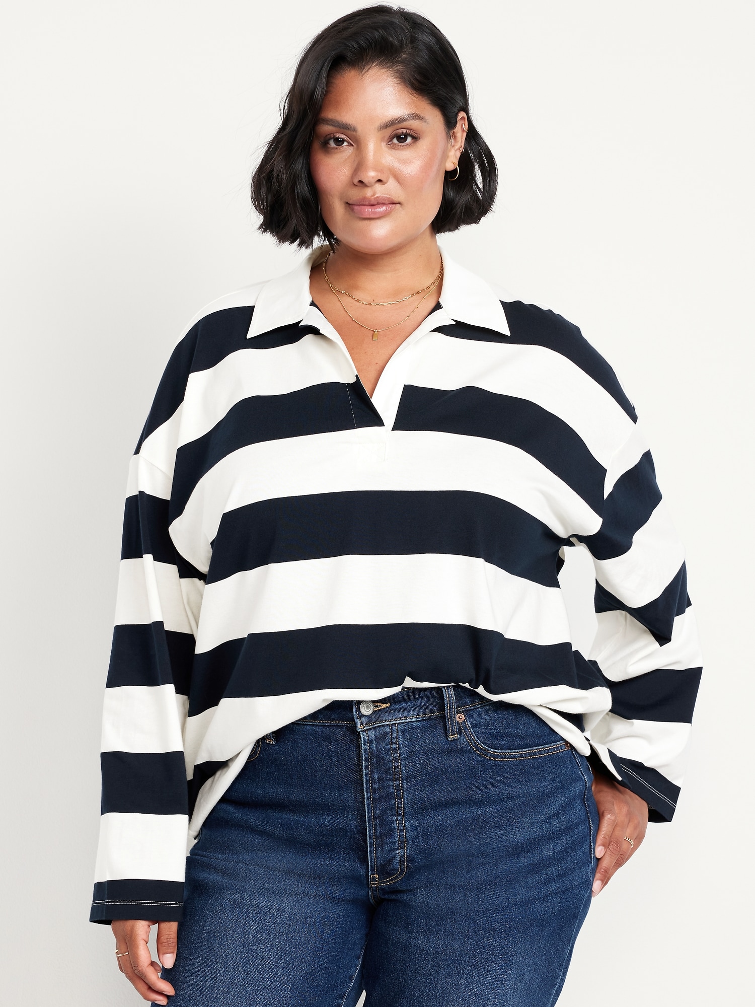 Oversized Rugby Polo: spread twill collar, long sleeves, wide contrasting stripes, #764298