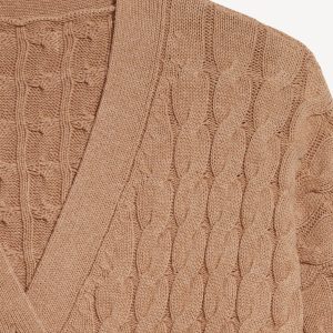Oversized Slouchy Cable-Knit Cardigan Sweater: deep v-neck, long sleeves, button front, contrasting tipped trim, #784426
