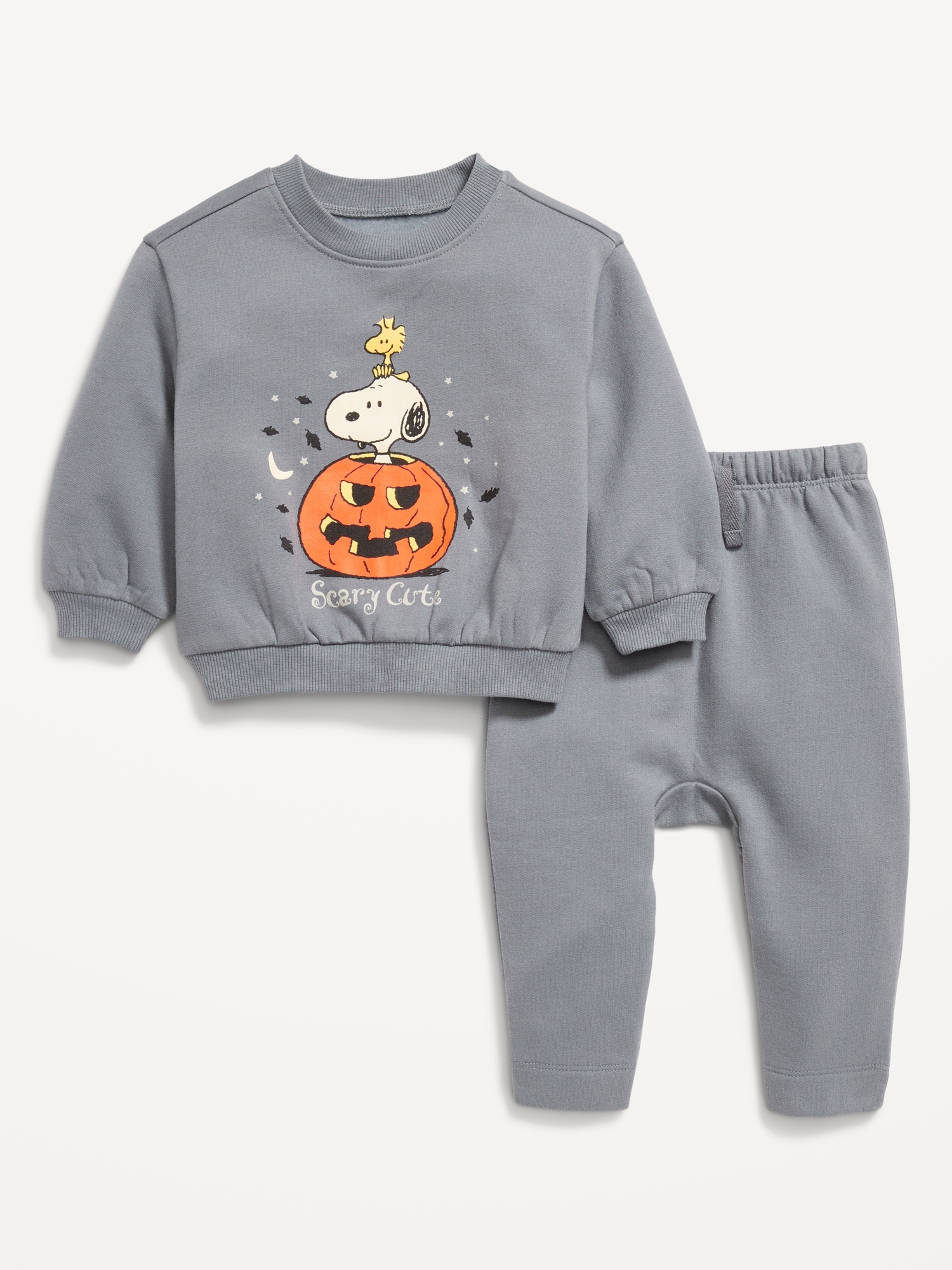 Peanuts™ Snoopy Graphic Sweatshirt and Pants Set for Baby: crew neck, long sleeves, drop shoulders, banded cuffs and hem, coordinating bottoms, elasticized waistband, functional drawstring, licensed graphic, © 2025 Peanuts Worldwide LLC, #803621