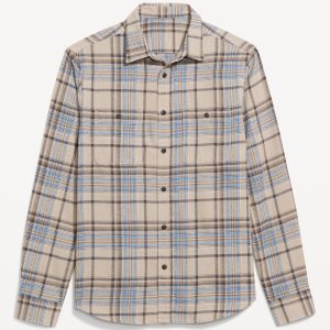 Plaid Flannel Pocket Shirt: spread collar, long sleeves with buttoned cuffs, button-patch chest pockets, full-button front, rounded hem, #801296