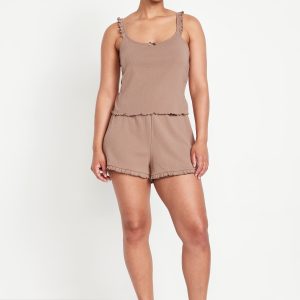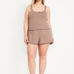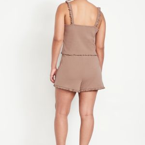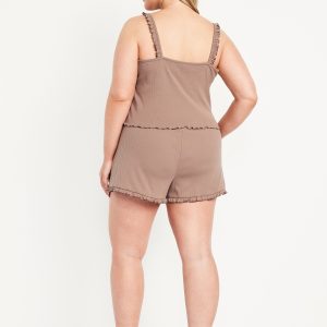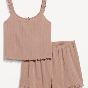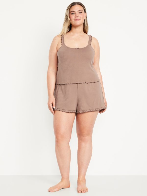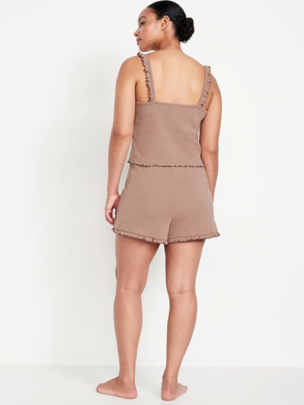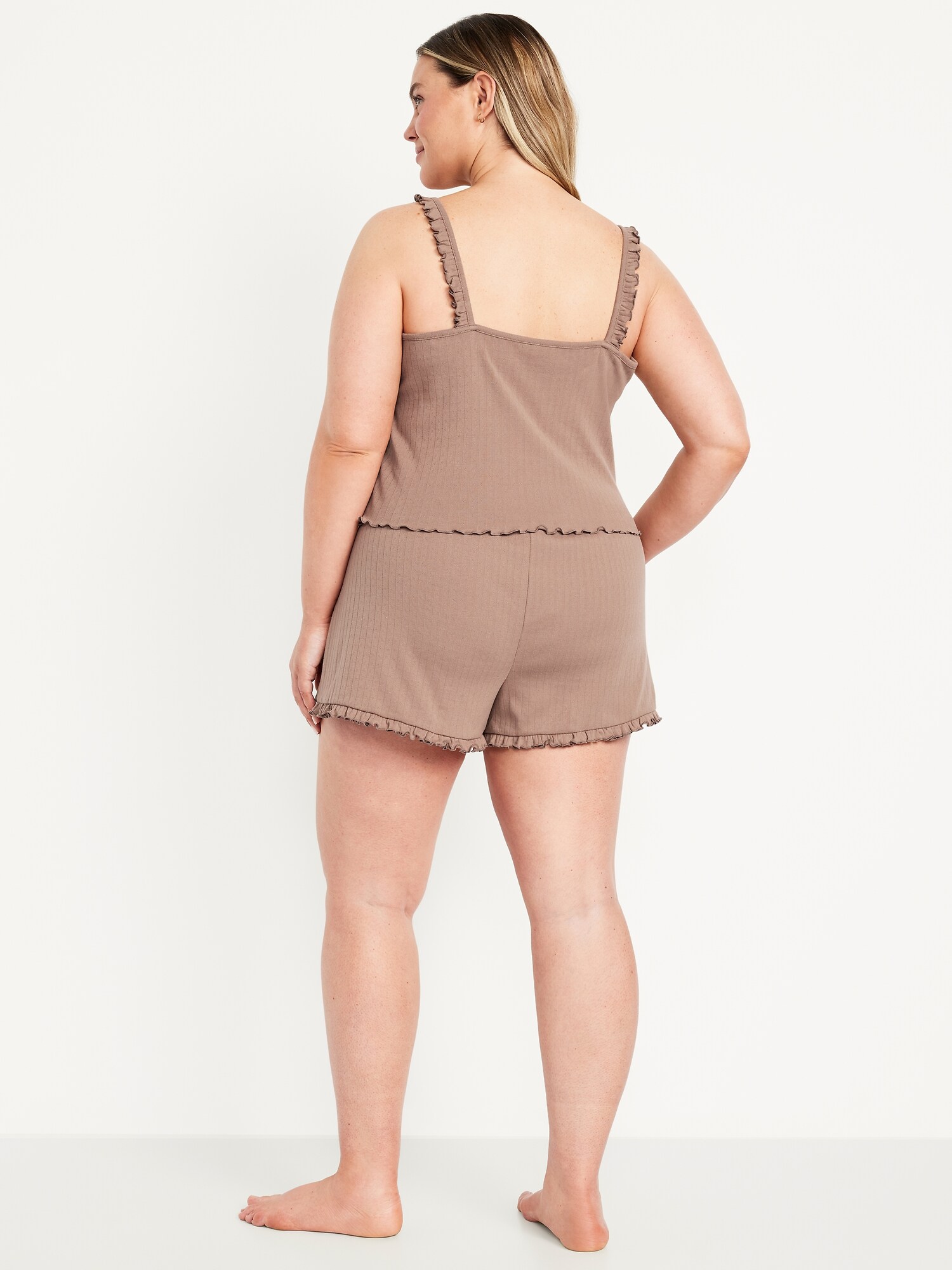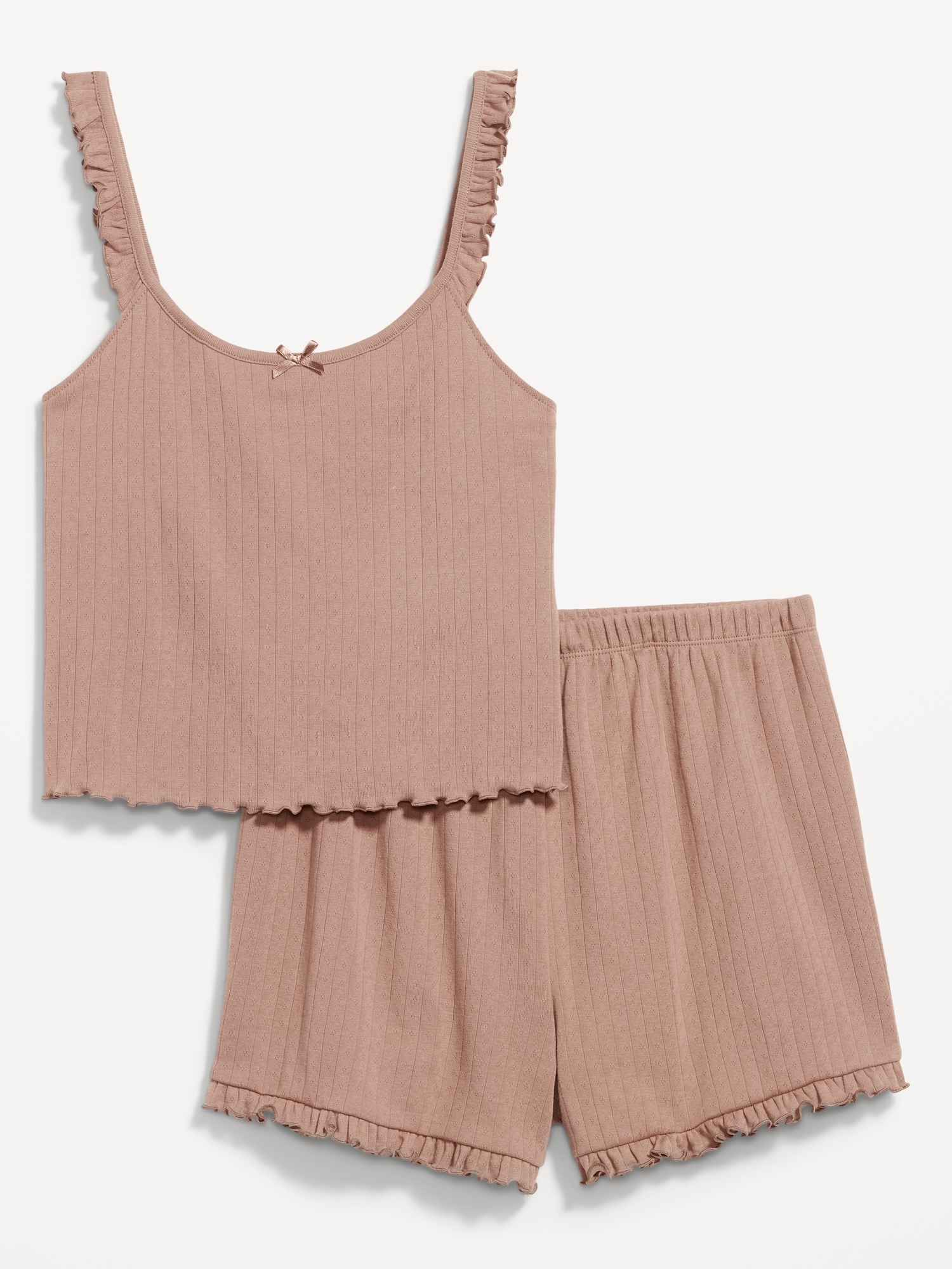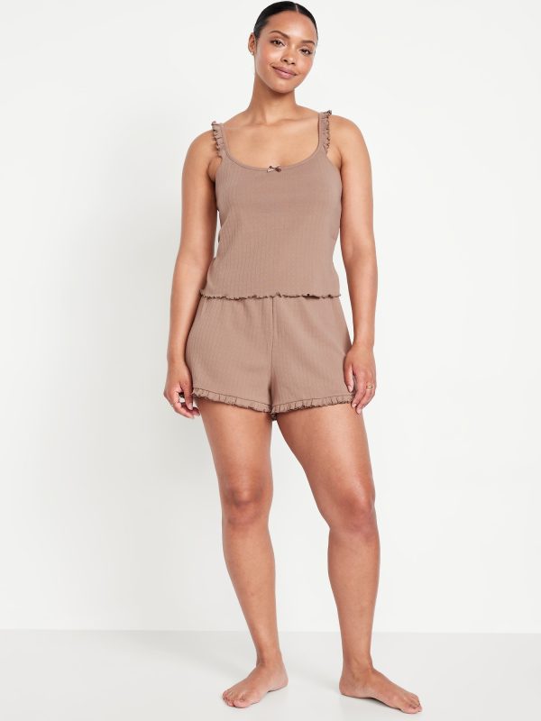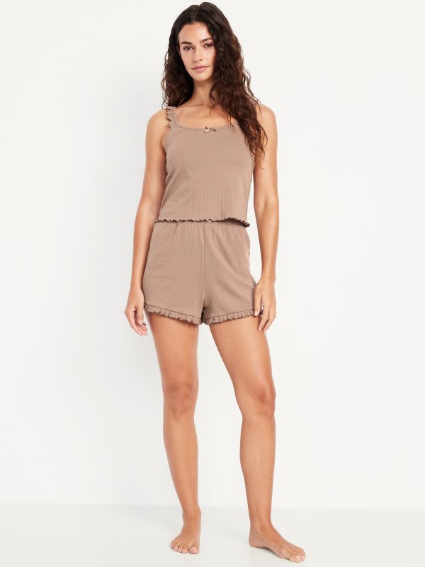 Pointelle Pajama Short Set: set includes cami sleep top and matching shorts, scoop neck with bow accent, ruffled straps, elastic-waist shorts with ruffled hem, #808329