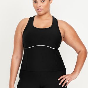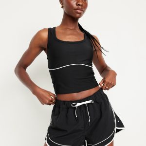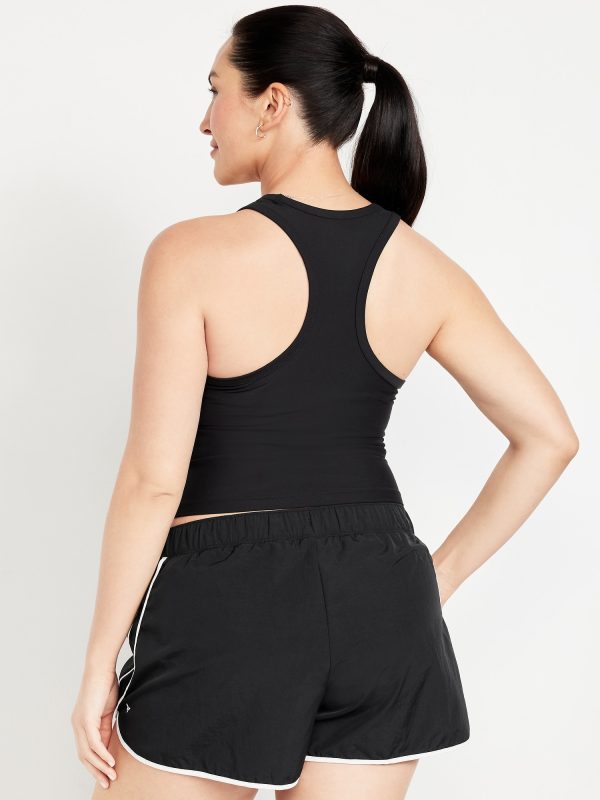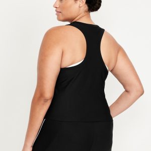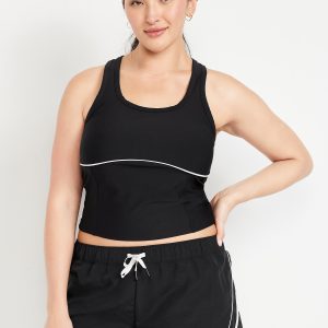 PowerSoft Racerback Cropped Shell Tank: Featuring PowerSoft. Light compression meets a peachy-smooth, sweat-wicking fabric.scoop neck, wide straps, racerback, contrasting piping, go-dry wicks moisture, #749263