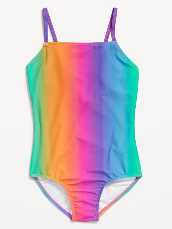 Printed Back Cutout One-Piece Swimsuit for Girls: square neckline, adjustable straps, deep cutout at back, all-over print, #660299