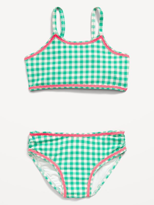 Printed Bikini Swim Set for Toddler & Baby: rounded neckline, thin straps, decorative crossover tie at back, matching bikini swim bottoms, all-over print, contrasting zig zag trim, #762436