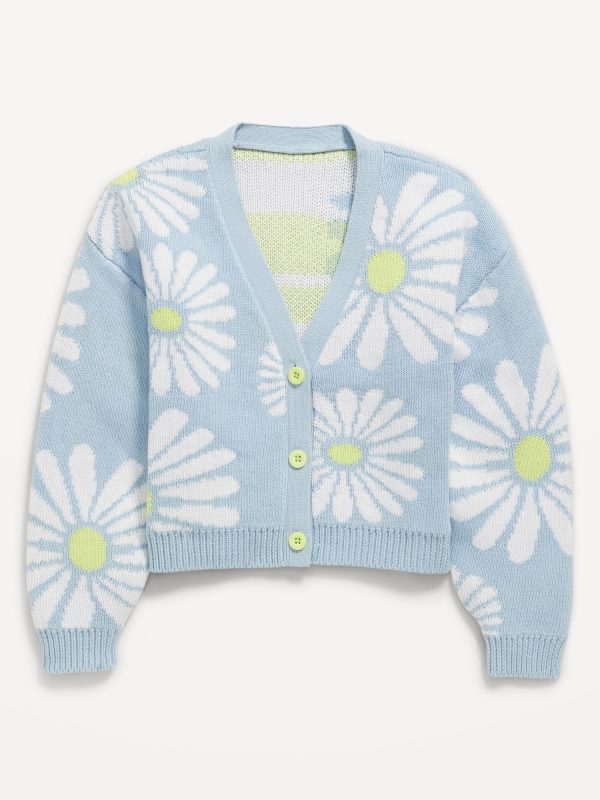 Printed Button-Front Cardigan Sweater for Girls: v neck, long sleeves, drop shoulders, buttoned placket, ribbed hem, all-over print, #766958
