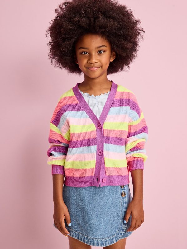 Printed Button-Front Cardigan Sweater for Girls: v neck, long sleeves, drop shoulders, buttoned placket, ribbed hem, all-over print, #766958