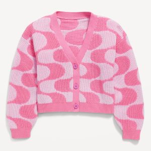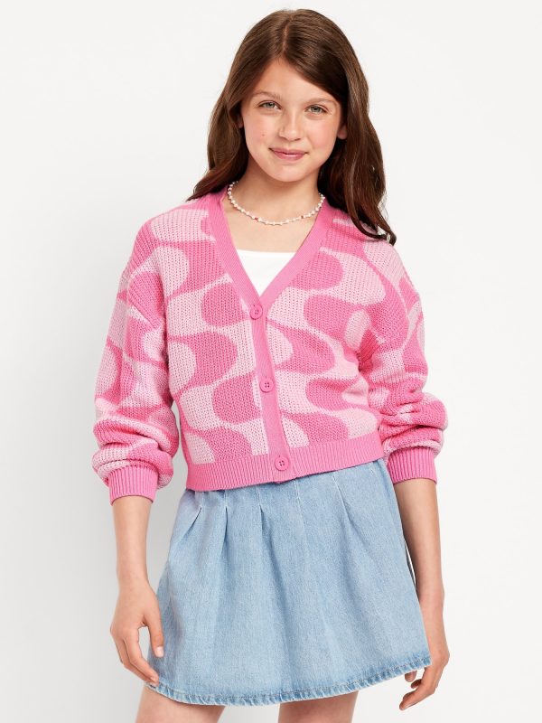 Printed Button-Front Cardigan Sweater for Girls: v neck, long sleeves, drop shoulders, buttoned placket, ribbed hem, all-over print, #766958