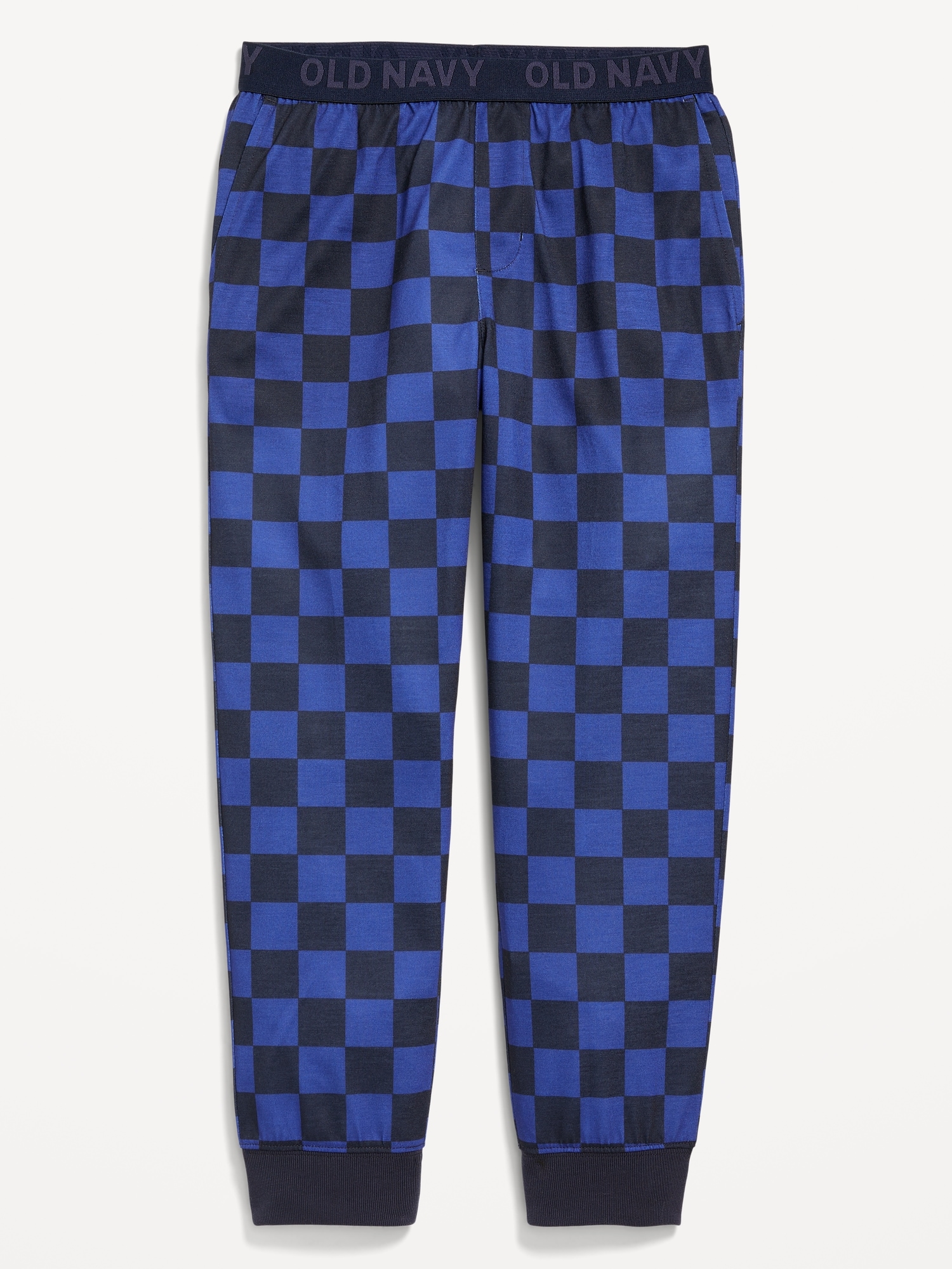 Printed Jersey-Knit Pajama Jogger Pants for Boys: elasticized waistband, repeating Old Navy logo at waist, diagonal on-seam pockets, rib-knit cuffs, all-over print, #487964
