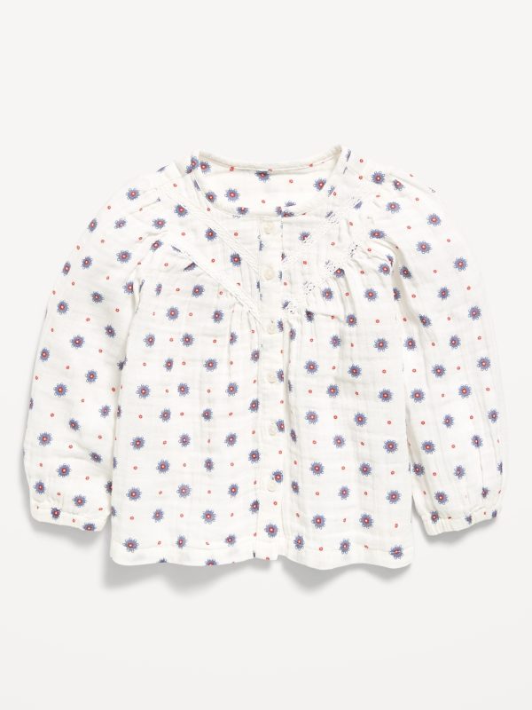 Printed Long-Sleeve Double-Weave Button-Front Top for Toddler Girls: round neckline, long puffy sleeves, full length button front, contrasting lace trim at front, all-over pattern, #804957