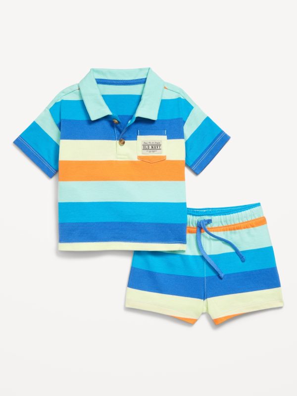 Printed Polo Shirt and Shorts Set for Baby: spread collar, two-button placket, short sleeves, drop shoulders, patch pocket at chest, small-scale embroidered logo patch at pocket, matching shorts, elasticized waistband, functional drawstring, all-over wide stripes, #761912