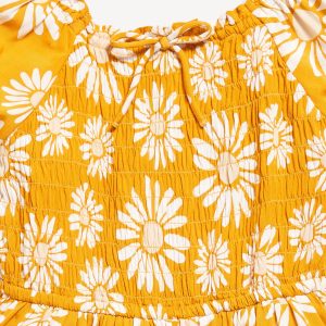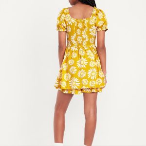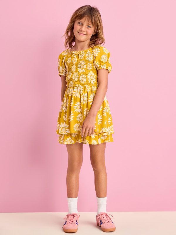 Printed Puff-Sleeve Smocked Dress for Girls: ruffled square neckline, short puff sleeves, smocked back, seamed waist, flowy skirt, built-in shorts, layered look at bottom, all-over print, #766638