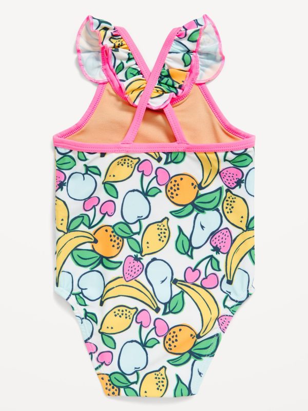 Printed Ruffled One-Piece Swimsuit for Baby: scoop neckline, ruffle trim straps cross at back, snaps at inseam, all-over pattern or print, #693848