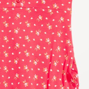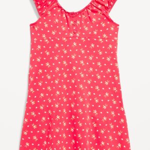 Printed Short-Sleeve Henley Dress for Girls: round neckline, elasticized cap sleeves, three-button henley placket, seamed waist, all-over print, #766644