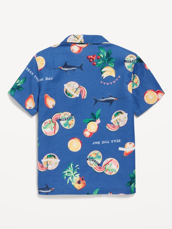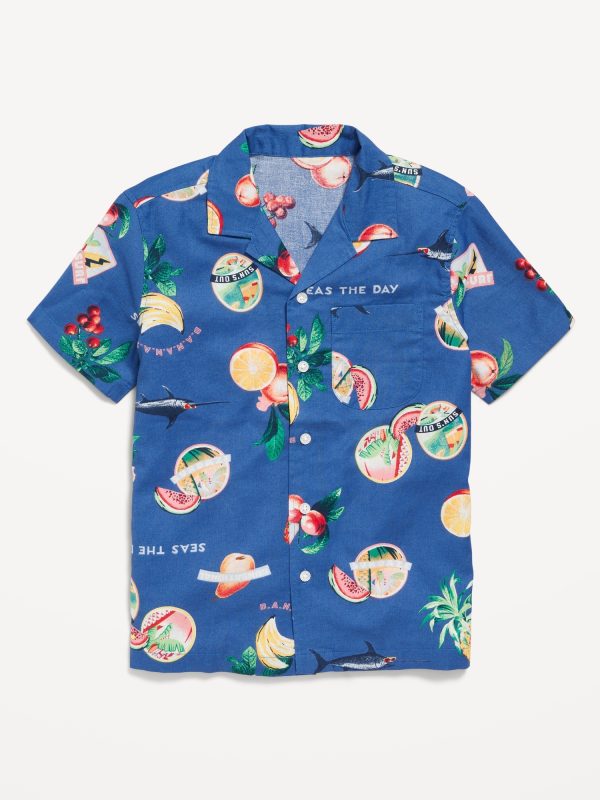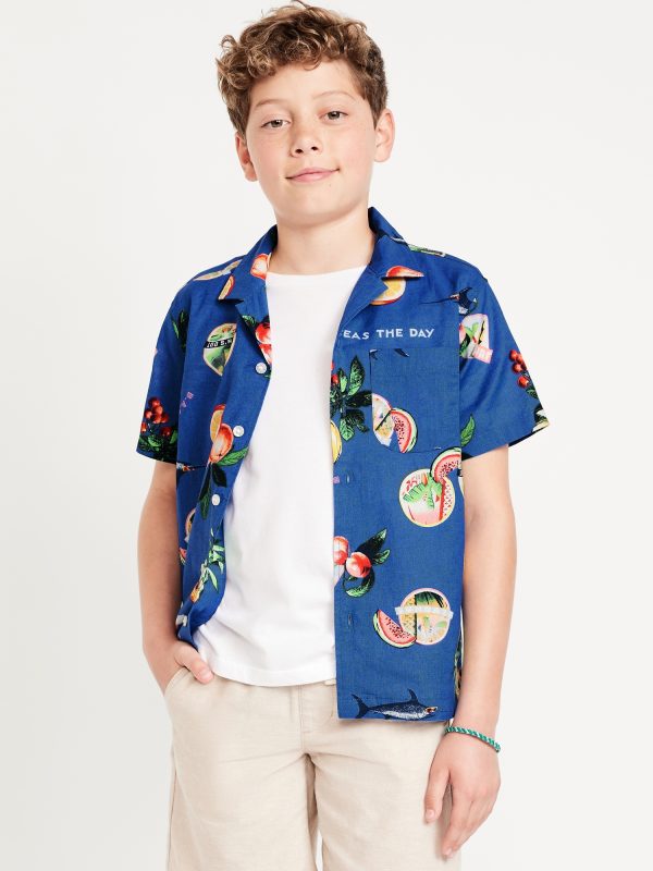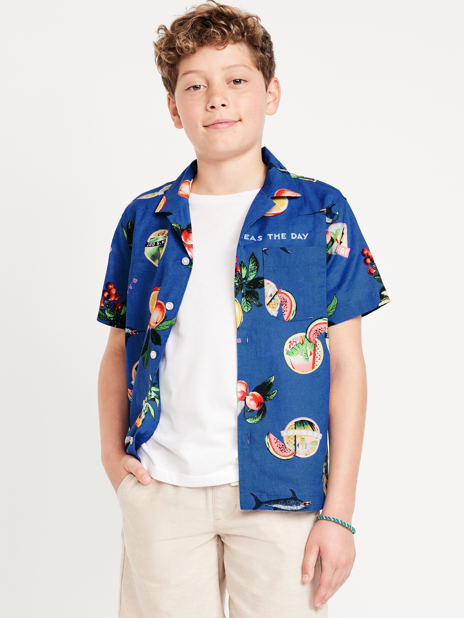 Printed Short-Sleeve Linen-Blend Pocket Shirt for Boys: spread collar, short sleeves, patch pocket at chest, full length button front, all-over print, #664479