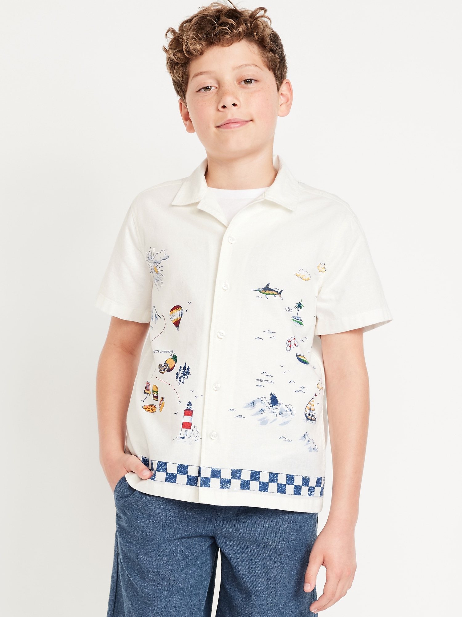 Printed Short-Sleeve Linen-Blend Shirt for Boys: spread collar, short sleeves, full length button front, all-over print, #664462