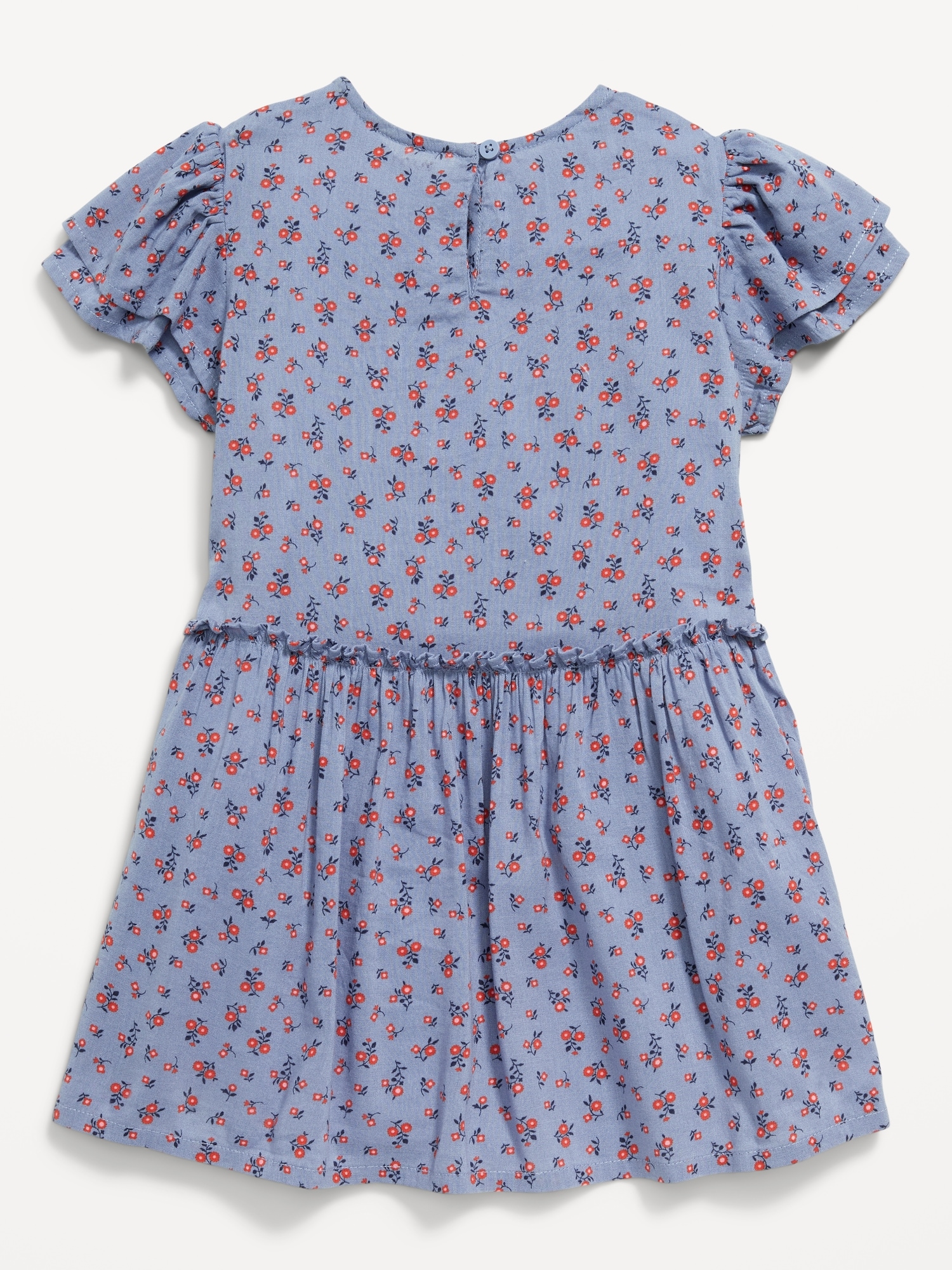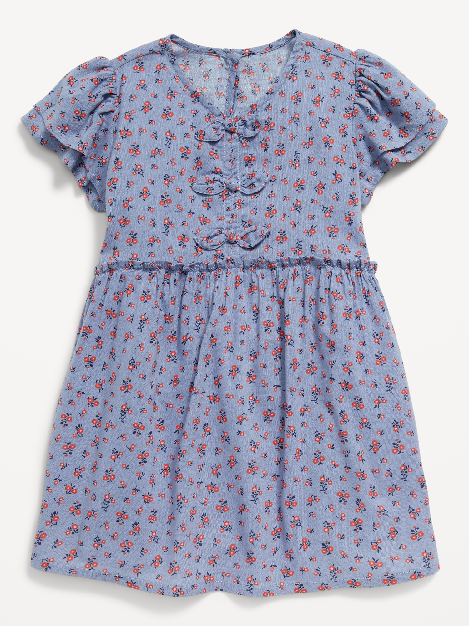Printed Short-Sleeve Ruffled Bow Dress for Toddler Girls: v neck, short flutter sleeves, keyhole cutout at nape, bows at chest, seamed ruffled waist, full skirt, all-over print, #805678