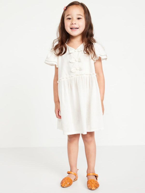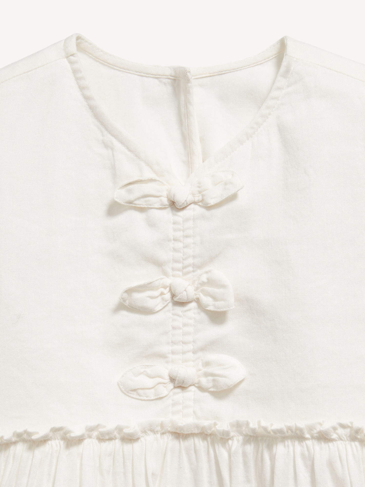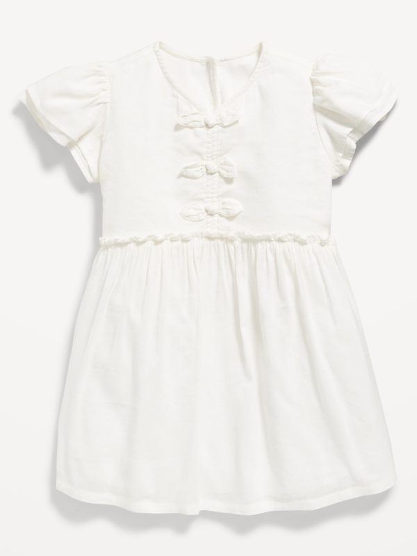Printed Short-Sleeve Ruffled Bow Dress for Toddler Girls: v neck, short flutter sleeves, keyhole cutout at nape, bows at chest, seamed ruffled waist, full skirt, all-over print, #805678