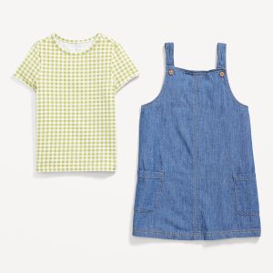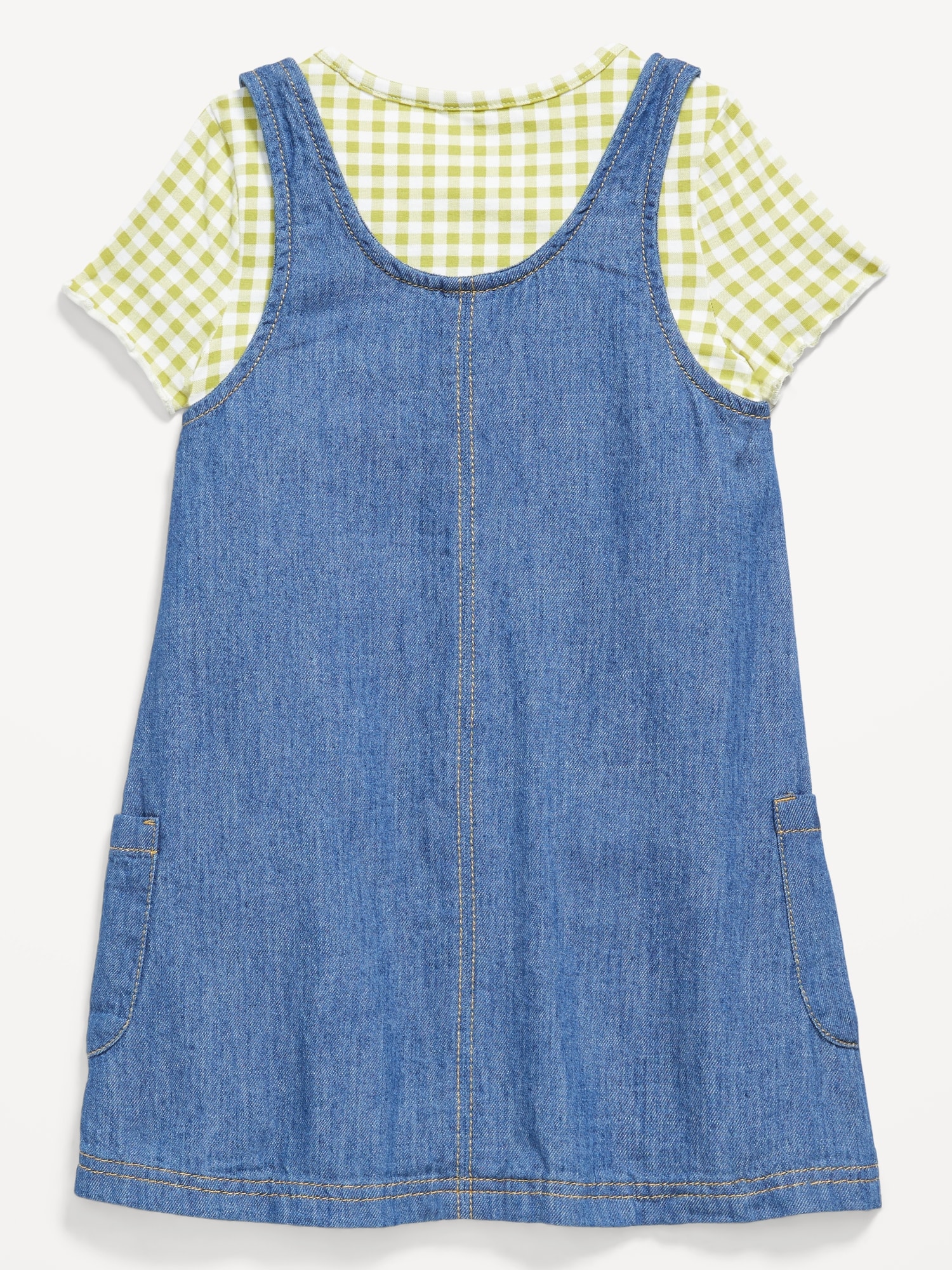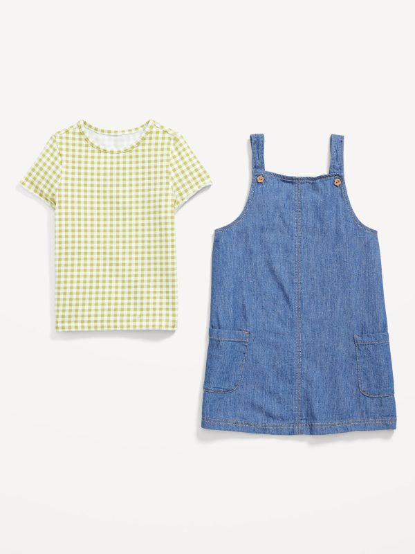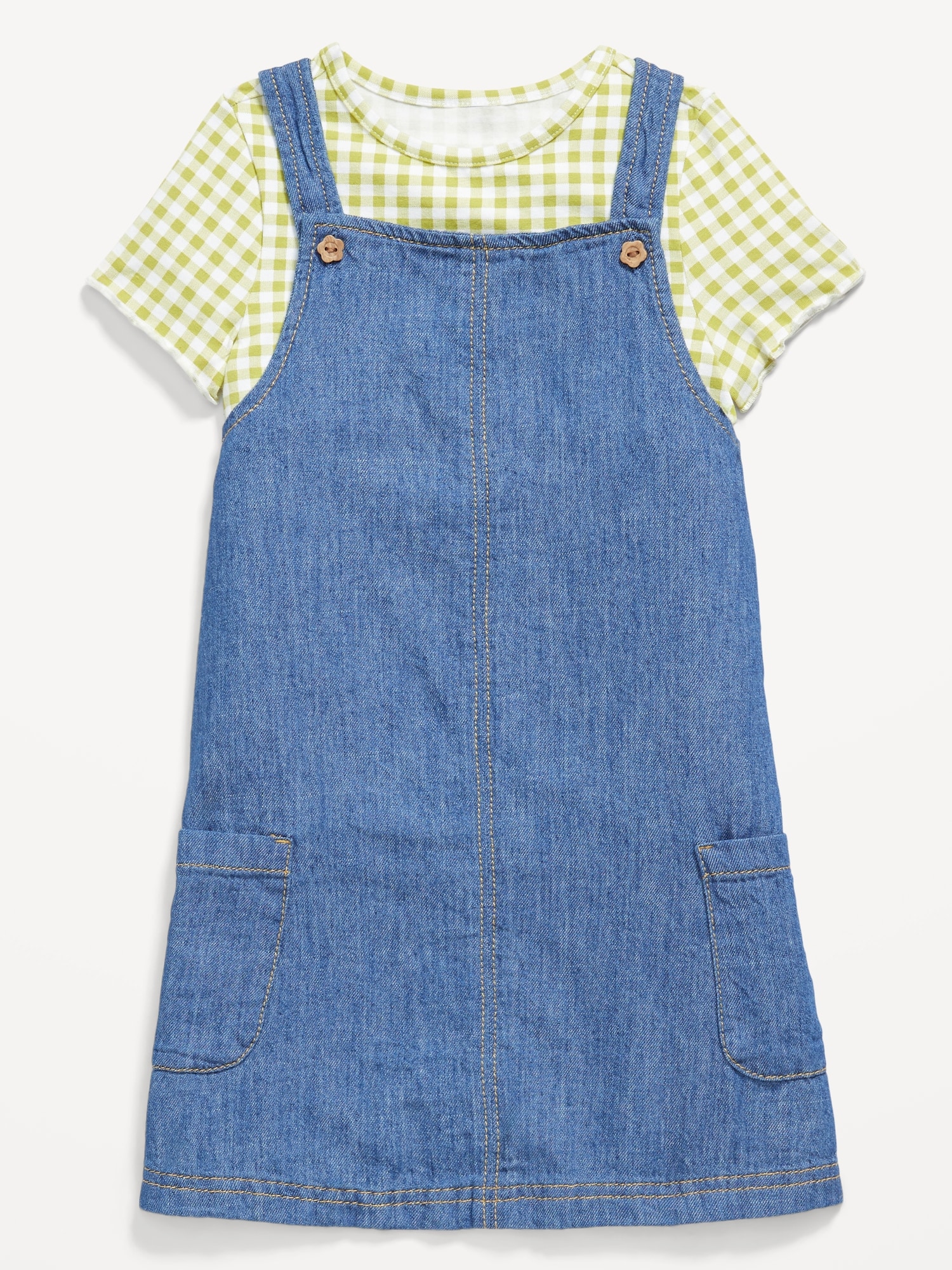 Printed Short-Sleeve T-Shirt and Jean Dress Set for Toddler Girls: crew neck, short sleeves, all-over print, coordinating dress, square neckline, scoop back, adjustable shoulder straps, side patch pockets, #766996