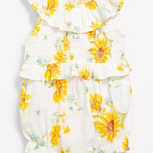Printed Sleeveless Smocked Jumpsuit for Baby: straight neckline, thin spaghetti straps, smocked bodice, hidden snaps along inseam, ruffled leg cuffs, all-over print, #689525