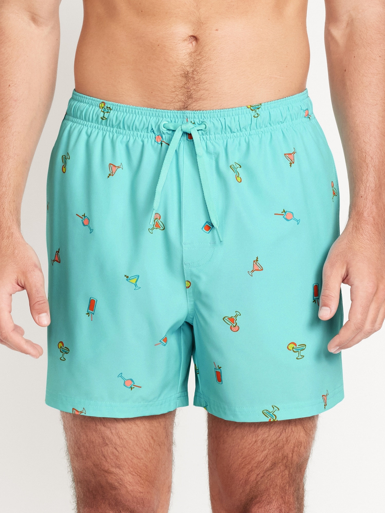 Printed Swim Trunks — 5-inch inseam: elastic-drawstring waistband, on-seam pockets, back pocket with grommet drain, built-in mesh briefs, pull-on style, all-over cocktail print, #766289