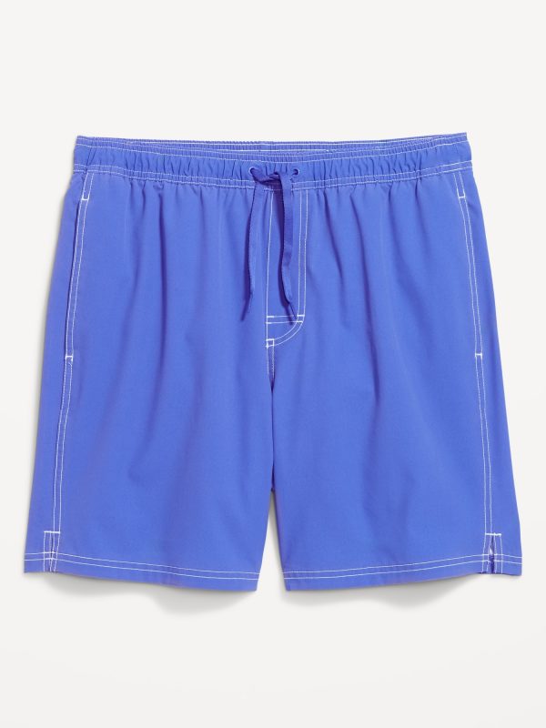 Printed Swim Trunks — 7-inch inseam: elastic-drawstring waistband, on-seam pockets, back patch pocket with grommet drain, built-in mesh briefs, pull-on style, #766290