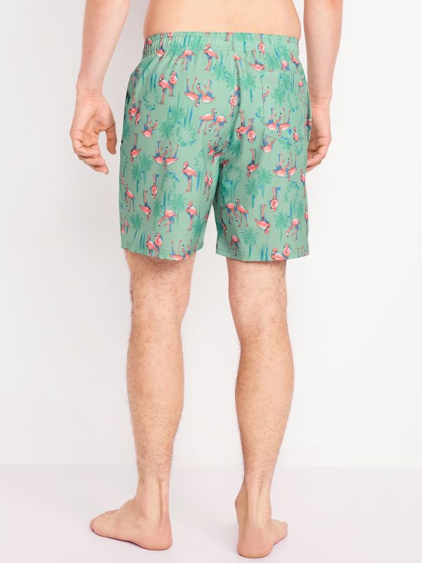 Printed Swim Trunks — 7-inch inseam: elastic-drawstring waistband, on-seam pockets, back patch pocket with grommet drain, built-in mesh briefs, pull-on style, #766290