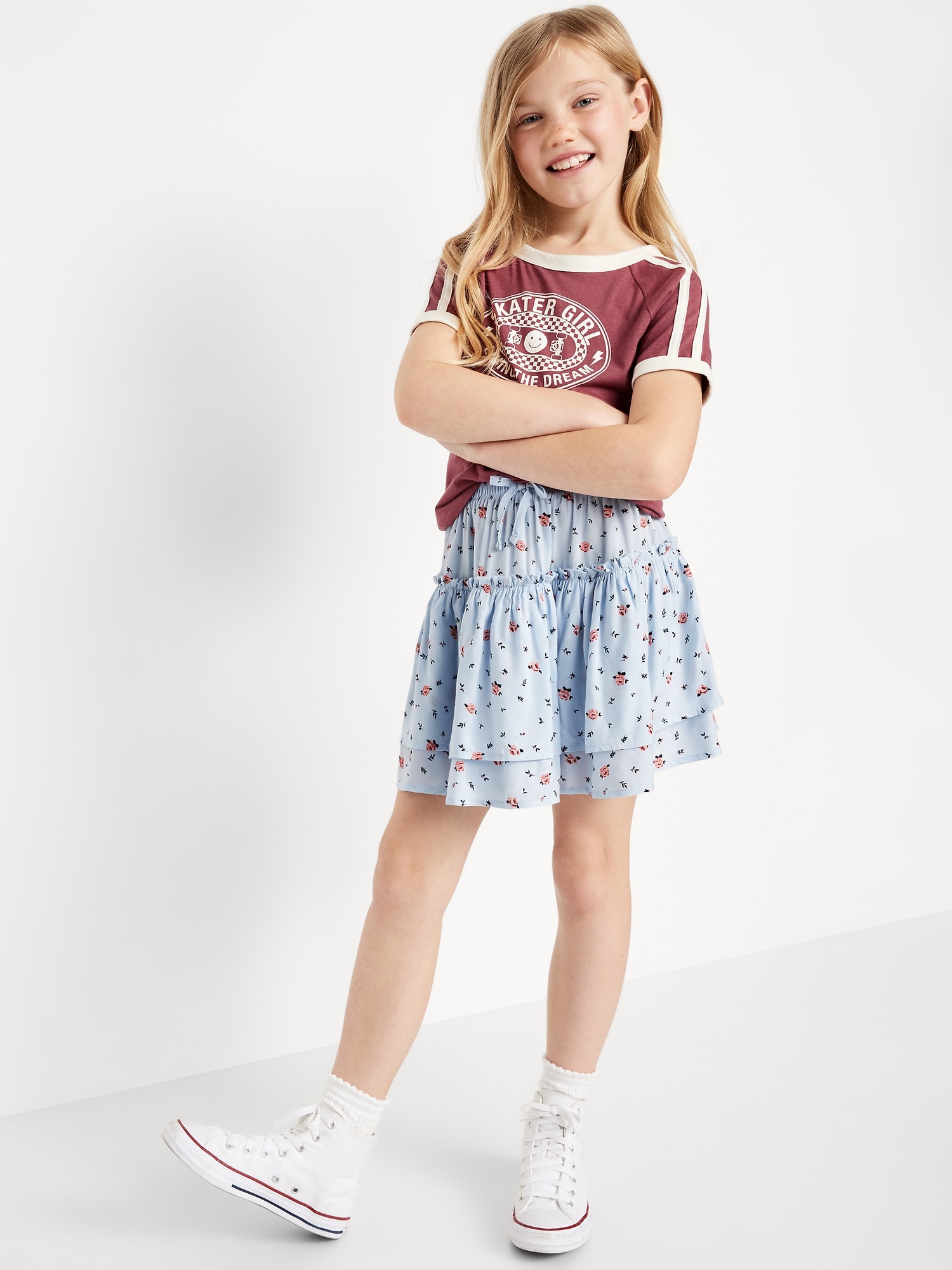 Printed Tiered Ruffled Skirt for Girls: elasticized waistband, decorative bow, ruffled trim, tiered, all-over print, #766620