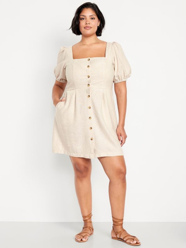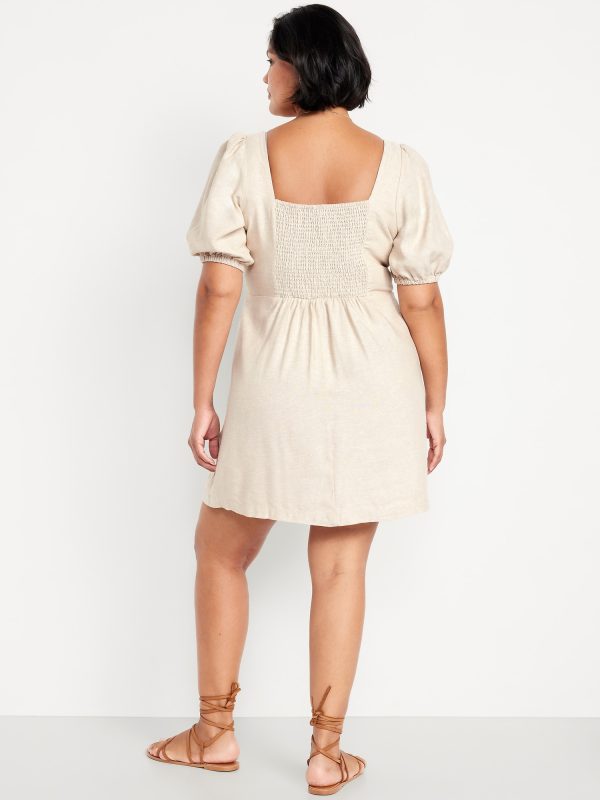 Puff-Sleeve Linen-Blend Mini Dress: square neck, short puff sleeves, elastic cuffs, full-button front, smocked back, diagonal hip pockets, seamed waist, #705712