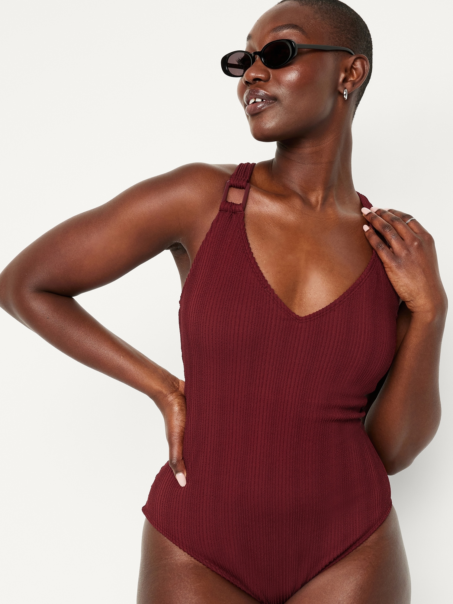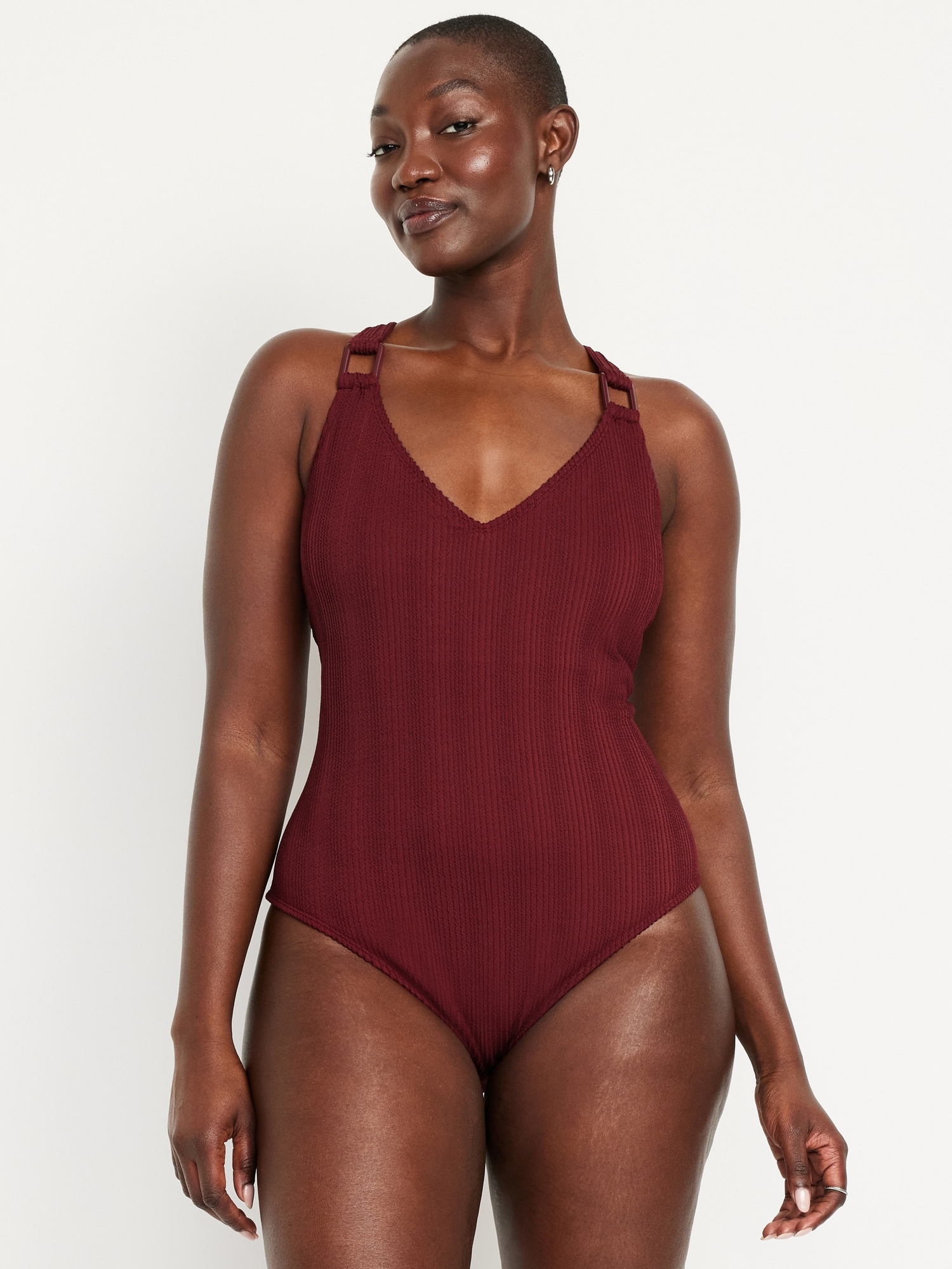 Ribbed One-Piece Swimsuit: v-neck, cross-back straps, removable pads, elastic leg openings, #660802