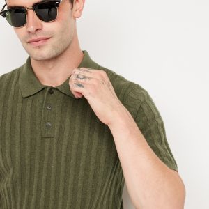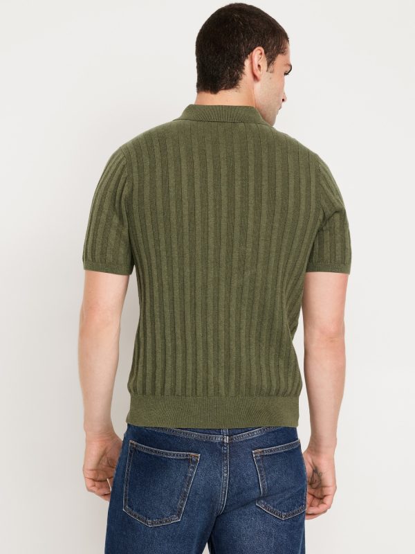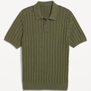 Ribbed Polo Sweater: spread collar, short sleeves, buttoned placket, pullover style, #802042