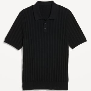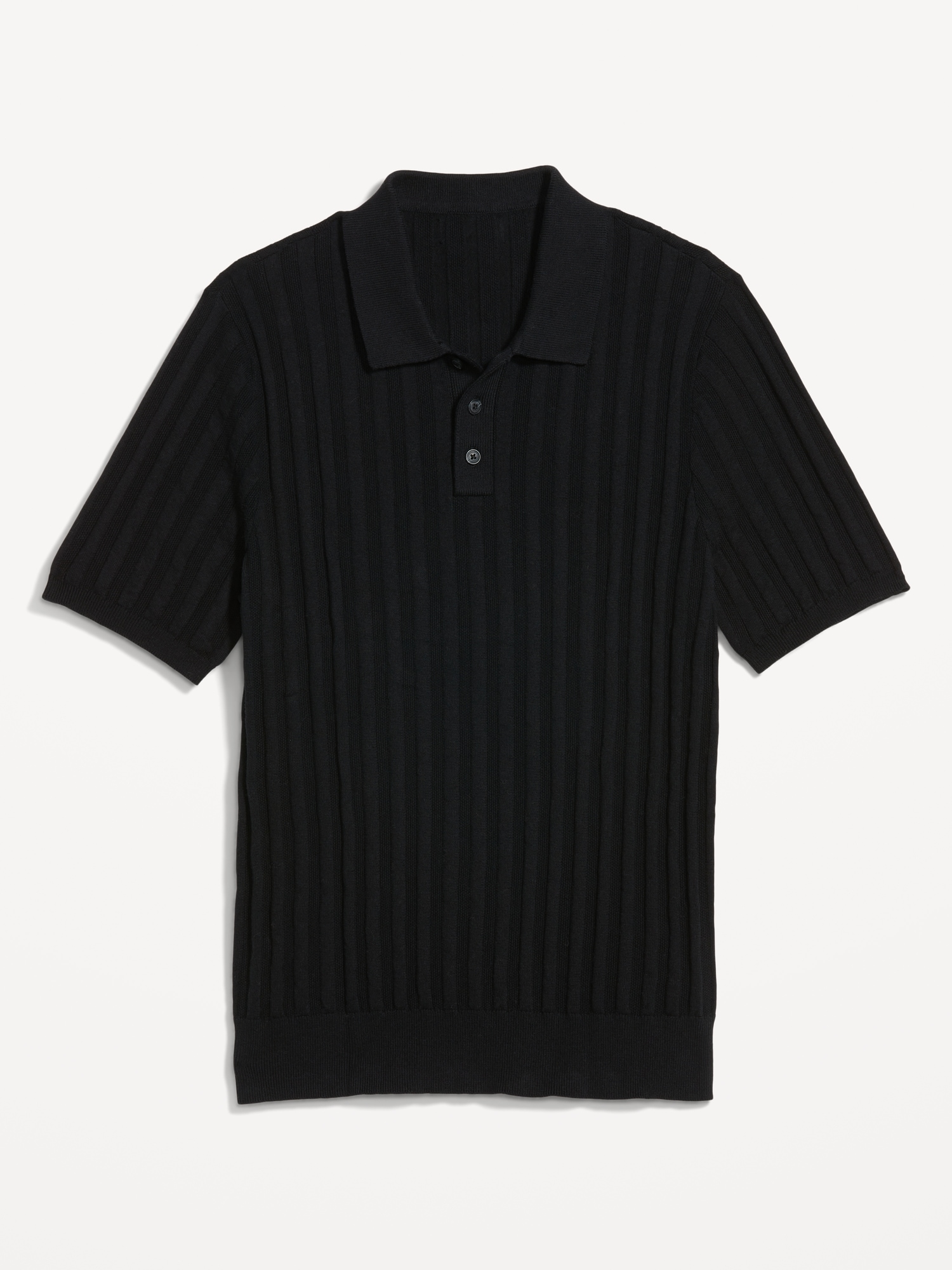 Ribbed Polo Sweater: spread collar, short sleeves, buttoned placket, pullover style, #802042