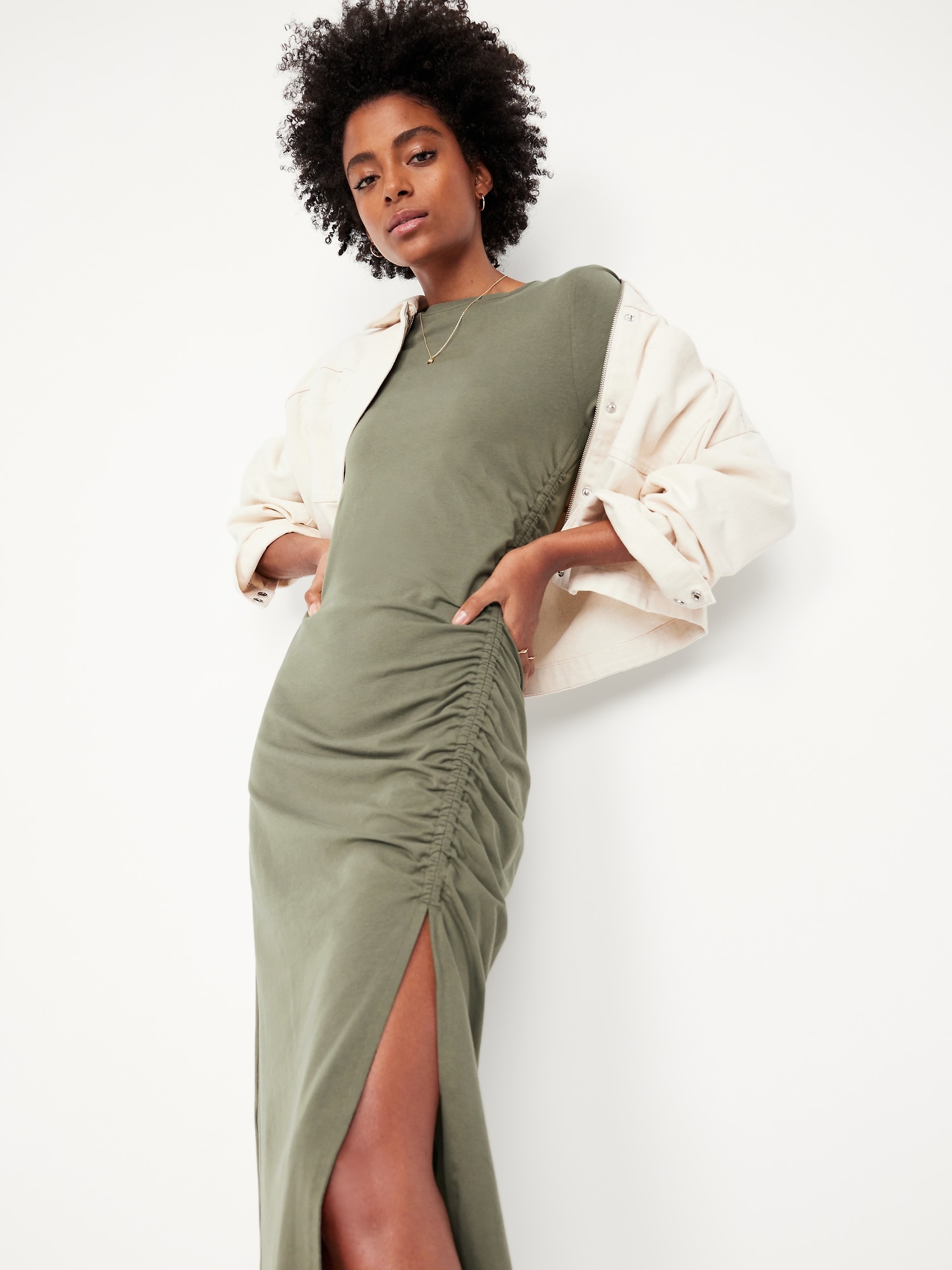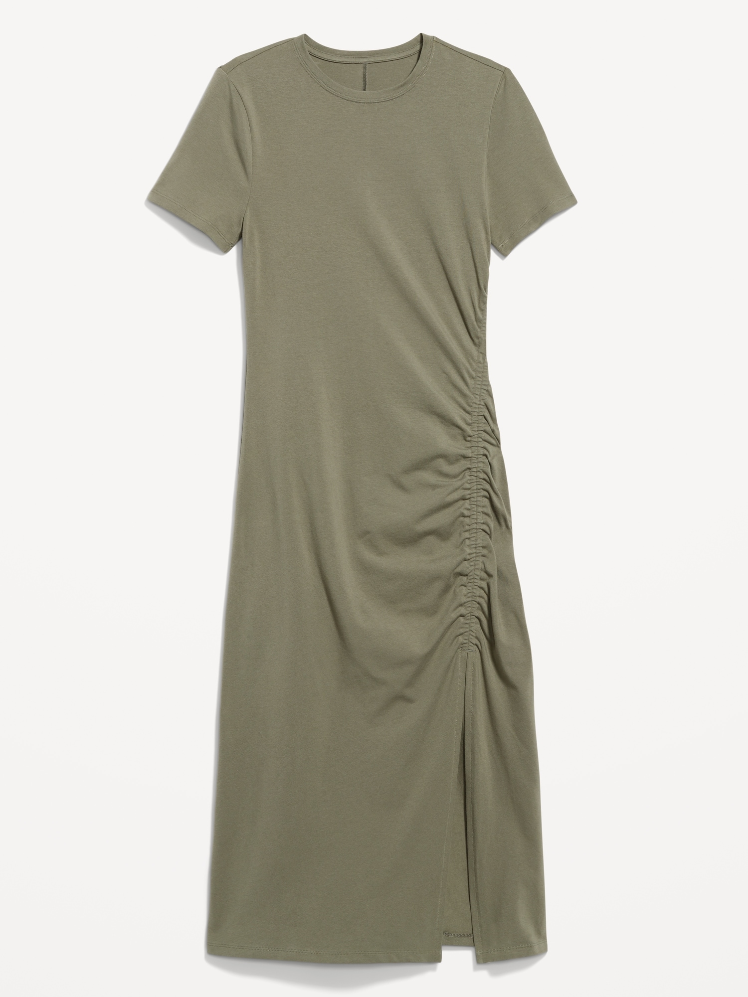 Ruched Midi T-Shirt Dress: crew neck, short sleeves, side ruching, front slit, #766918