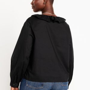 Ruffle Button-Down Shirt: ruffle collar, long sleeves, shirred-button cuffs, full-button front, plaid print, #805732