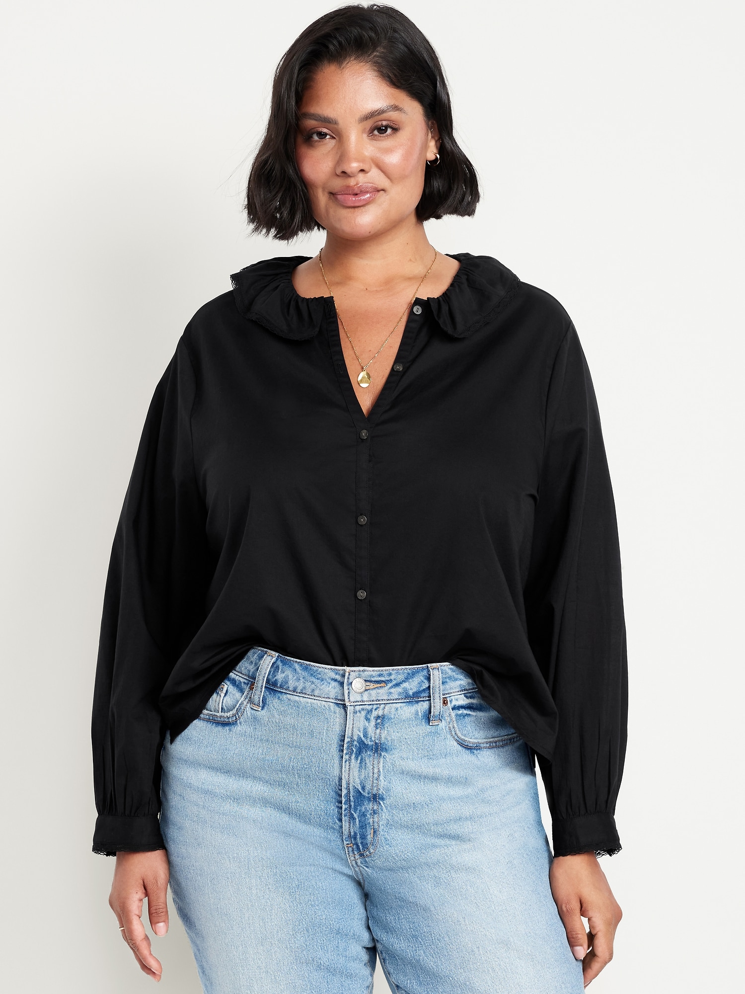 Ruffle Button-Down Shirt: ruffle collar, long sleeves, shirred-button cuffs, full-button front, plaid print, #805732