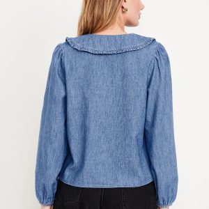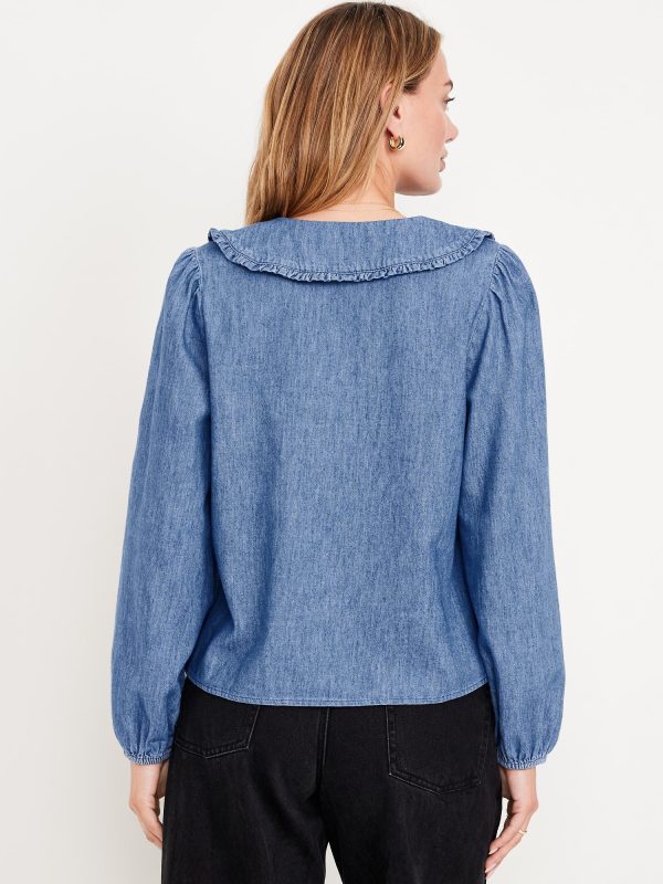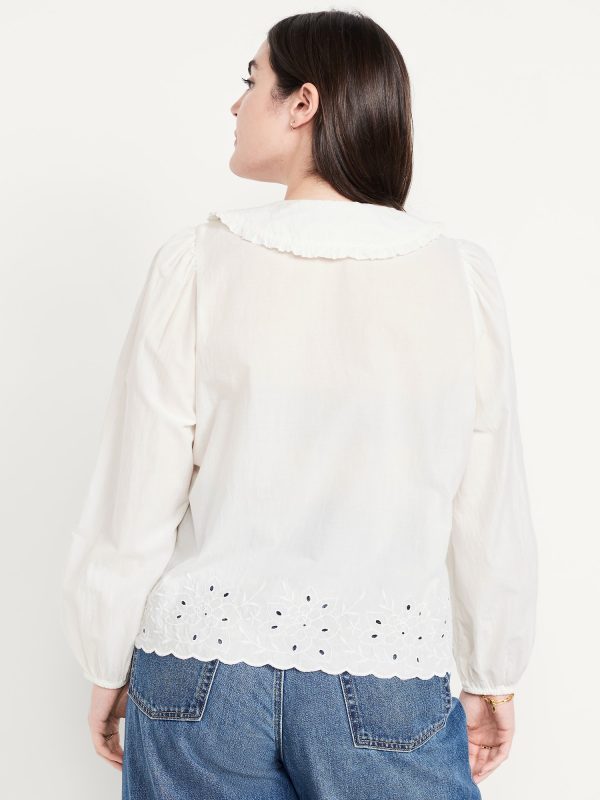Ruffle-Collar Cutwork Top: ruffled tie-neck collar, long blouson sleeves with elastic cuffs, cutwork hem, shirred detail, #805736