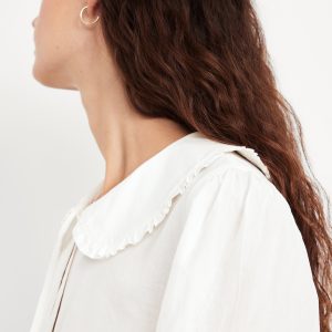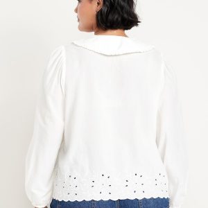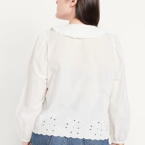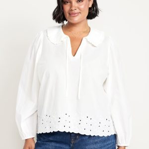 Ruffle-Collar Cutwork Top: ruffled tie-neck collar, long blouson sleeves with elastic cuffs, cutwork hem, shirred detail, #805736
