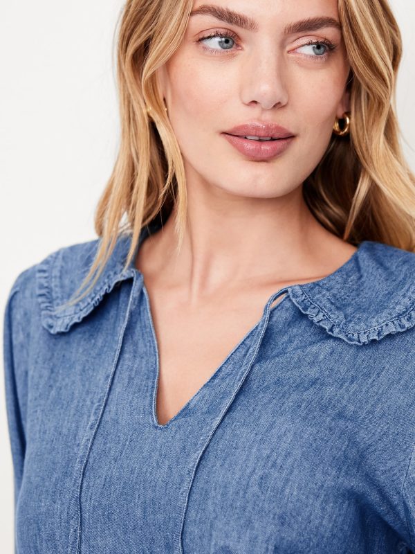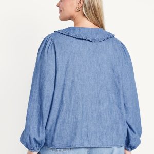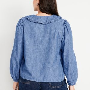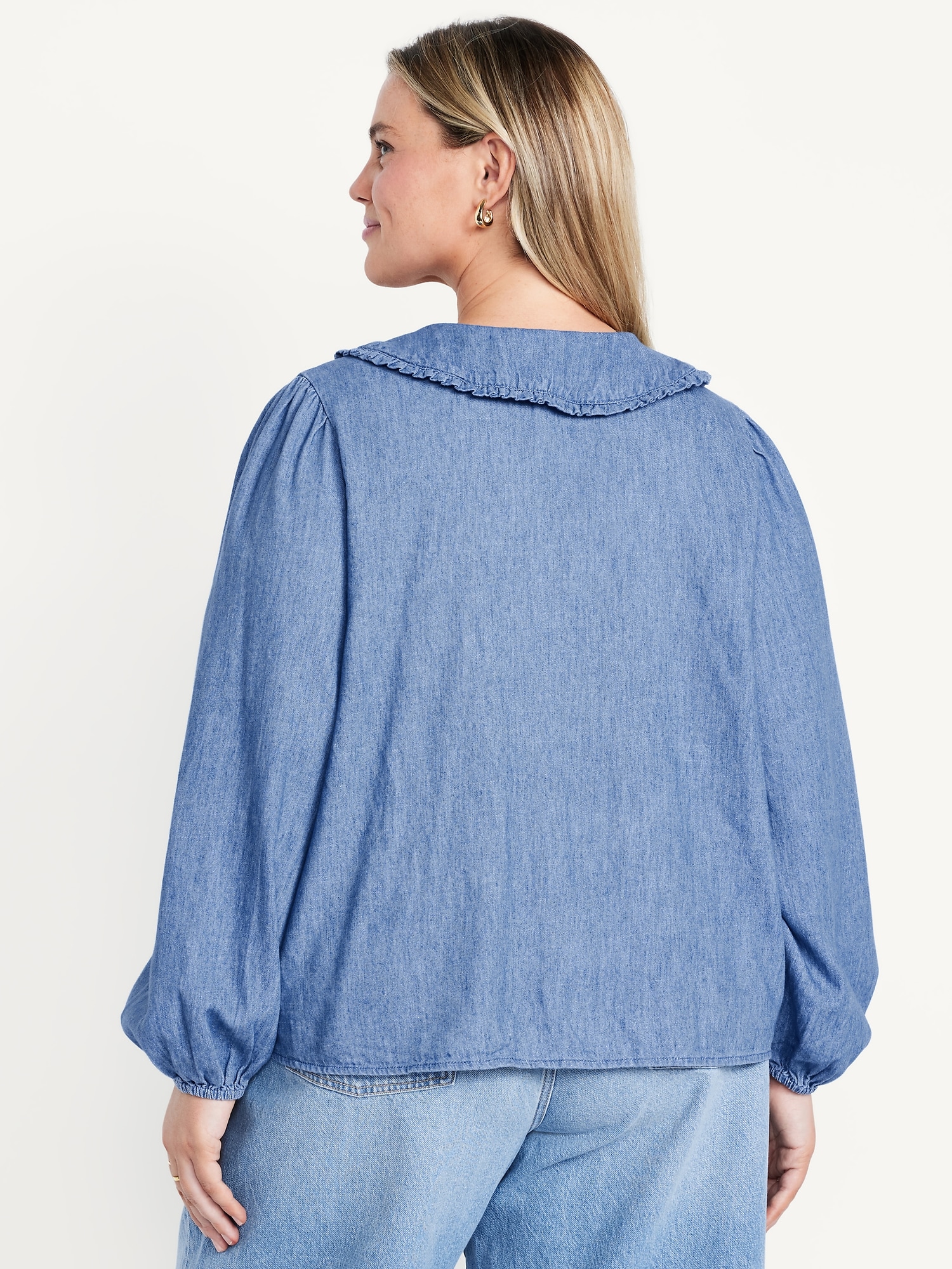 Ruffle-Collar Top: ruffled tie-neck collar, long blouson sleeves with elastic cuffs, cutwork hem, shirred detail, #805736