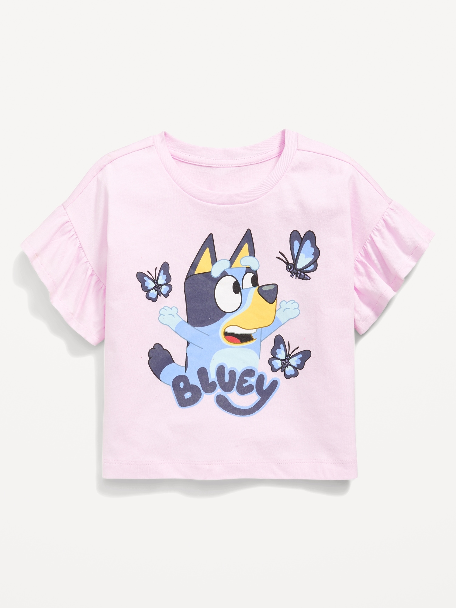 Ruffle-Sleeve Licensed Graphic T-Shirt for Toddler Girls: crew neck, short ruffled sleeves, all-over licensed graphic, BLUEY™ and character logo™ and © Ludo Studio. Licensed by BBC Studios Distribution Ltd., © 2025 SANRIO CO. LTD. Used Under License., #762103