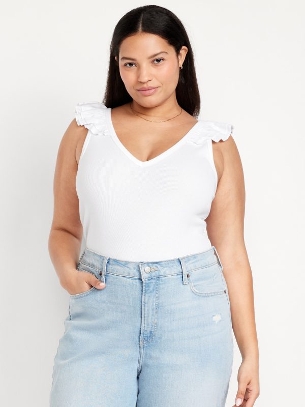 Ruffle-Trim Mixed Material Top: v-neck, ruffled sleeve openings, #686637