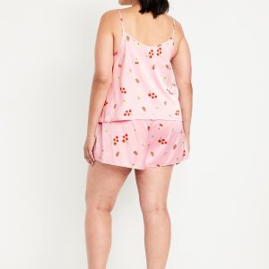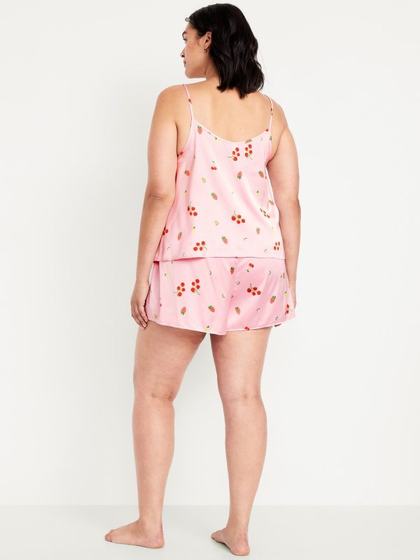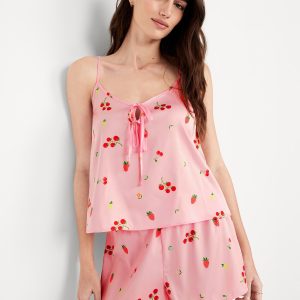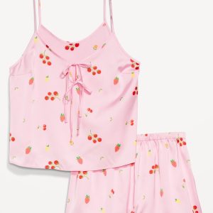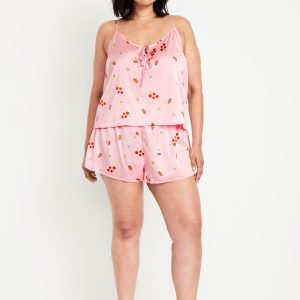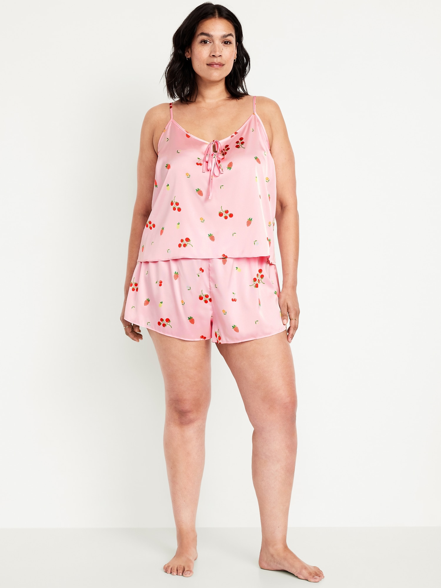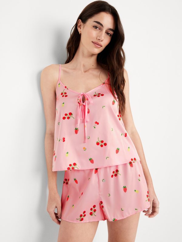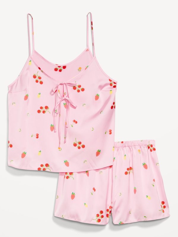 Satin Pajama Short Set: set includes cami sleep top and matching shorts, tie-front neck, spaghetti straps, elastic-waist shorts, #766748