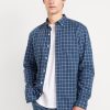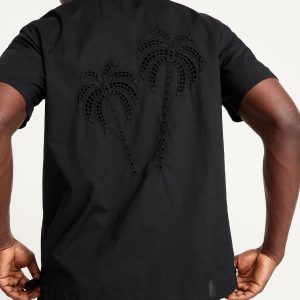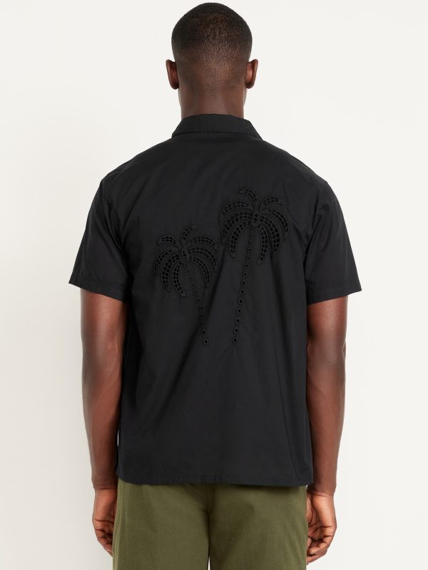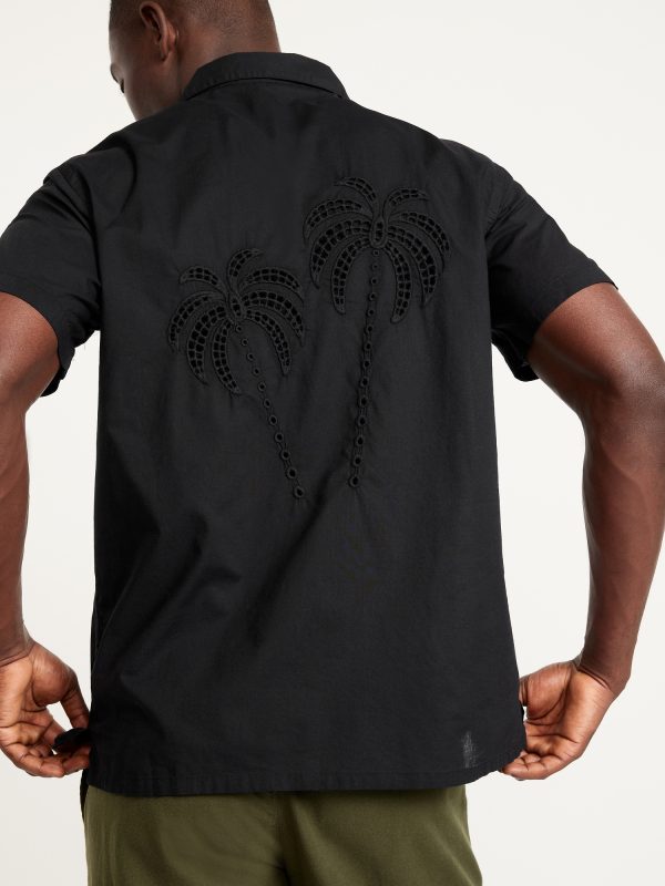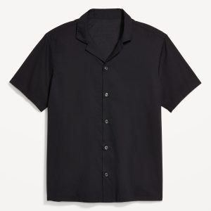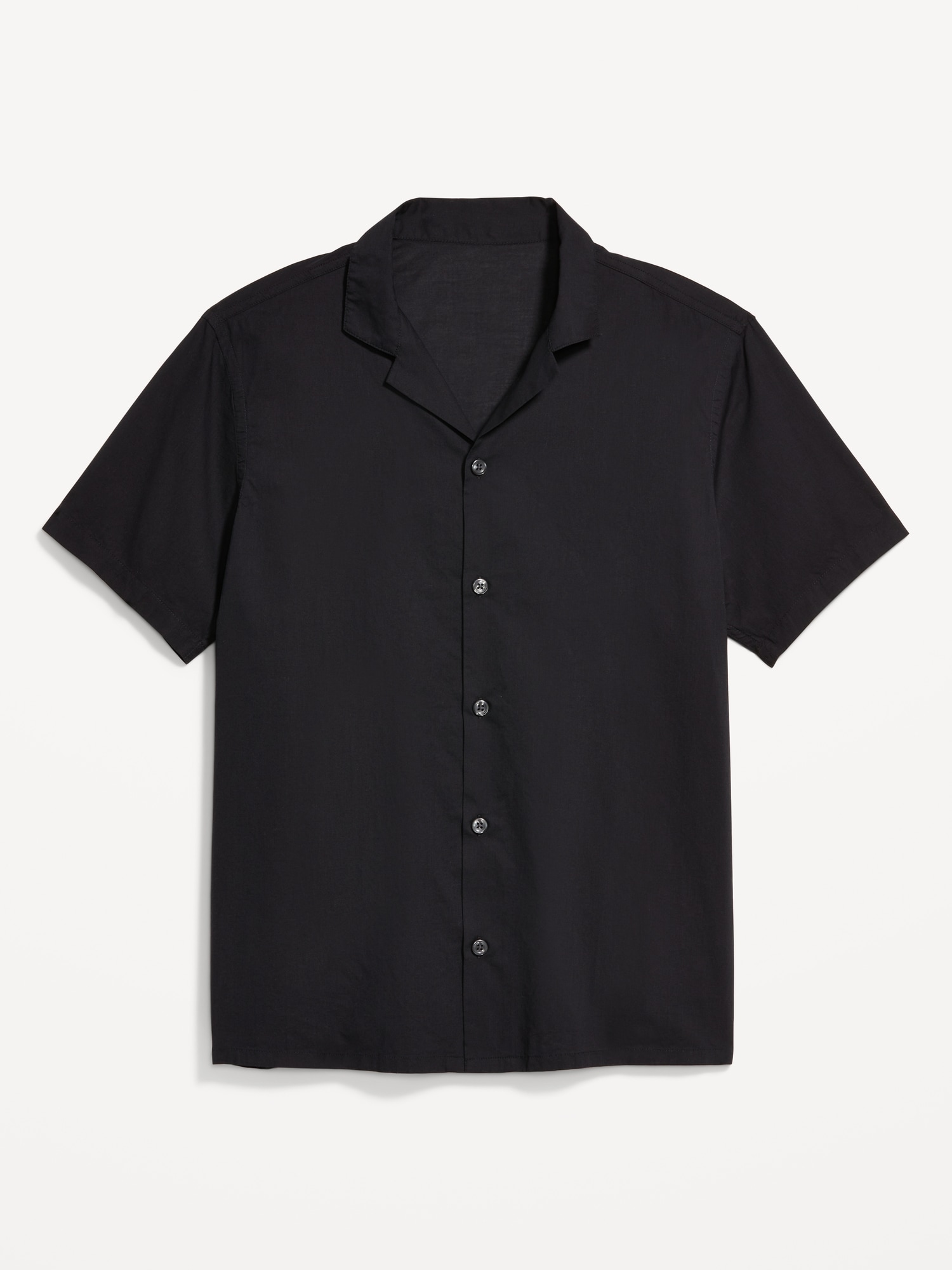 Short-Sleeve Camp Shirt: notched collar, short sleeves, full-button front, vertical striped print, #762762